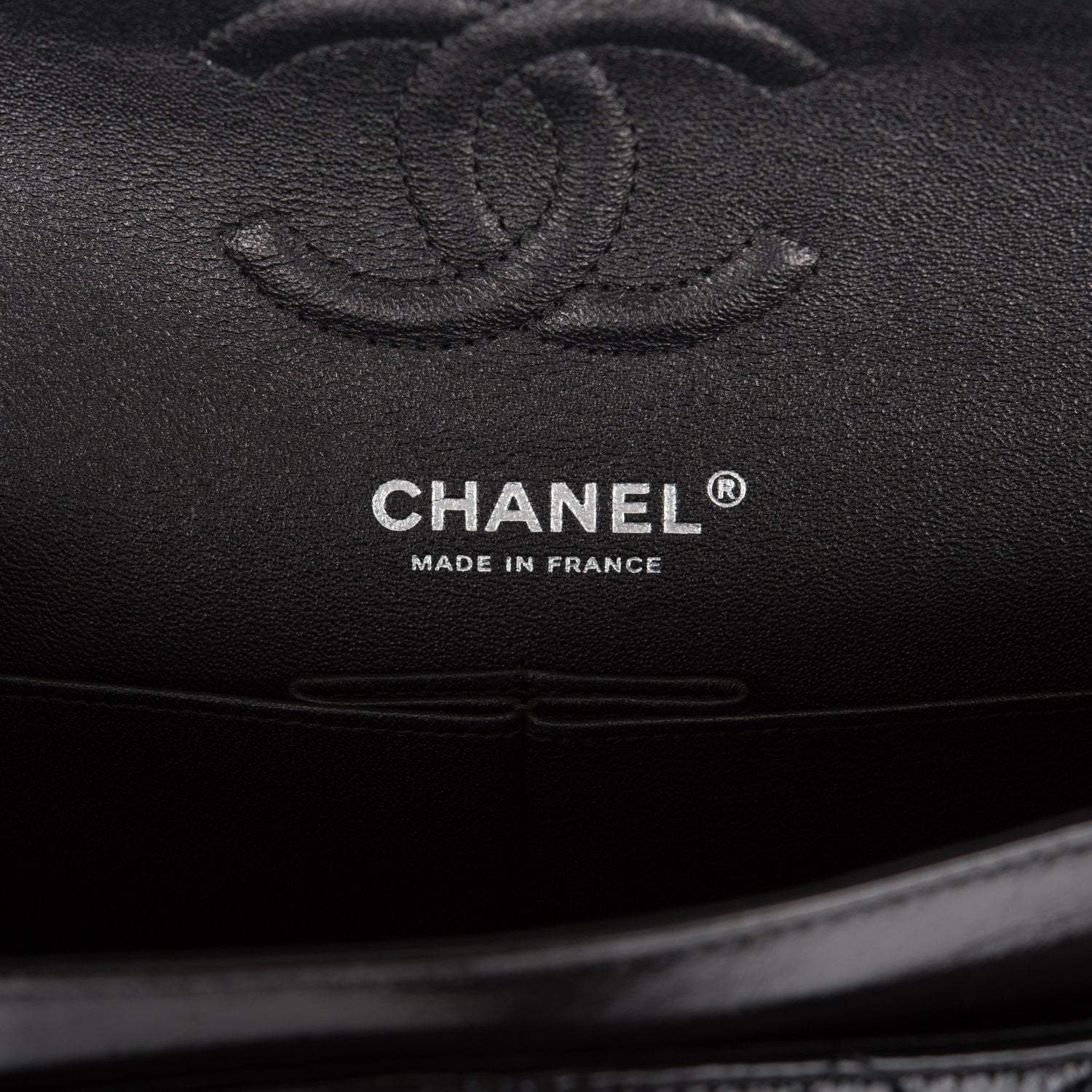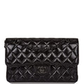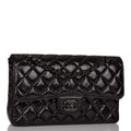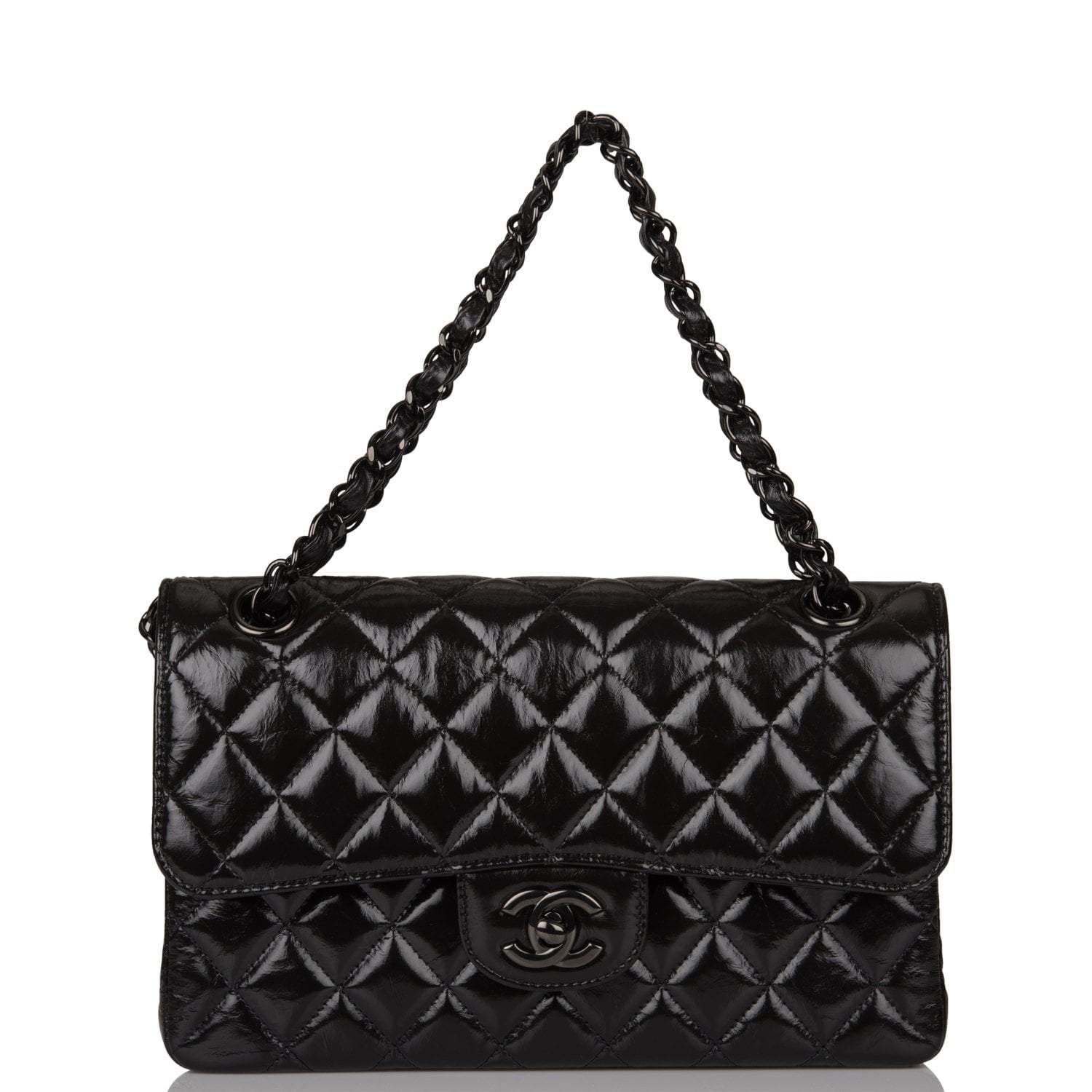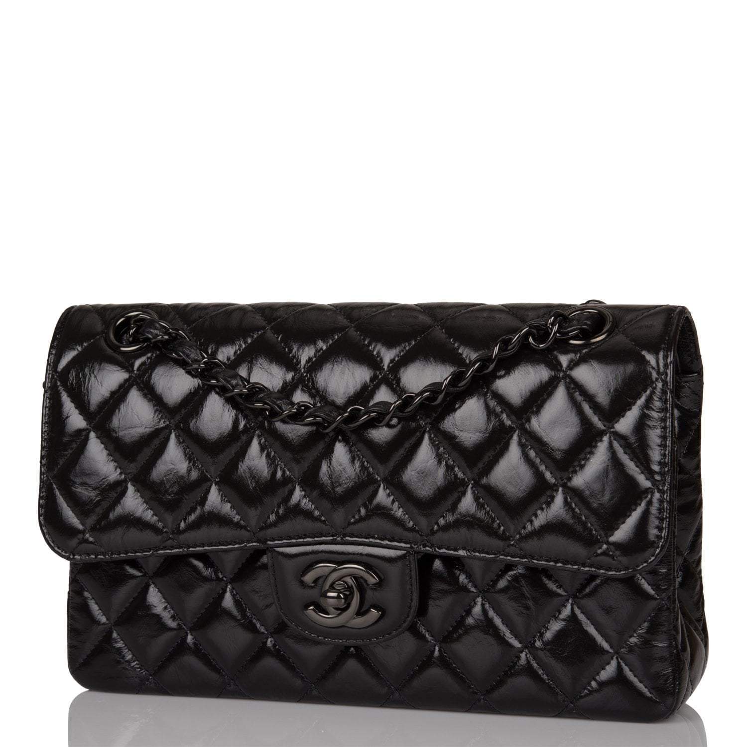 This Small Classic Double Flap bag is in shiny black crumpled calfskin leather with black hardware and features a front flap with signature CC turnlock closure, half moon back pocket, and adjustable interwoven black chain link and black leather shoulder strap.