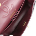 The interior is lined in burgundy leather with the "love letter" zipper compartment underneath the first flap, an "outer" slit pocket under the second flap, and an interior compartment with two open pockets separated by a "lipstick" compartment.