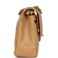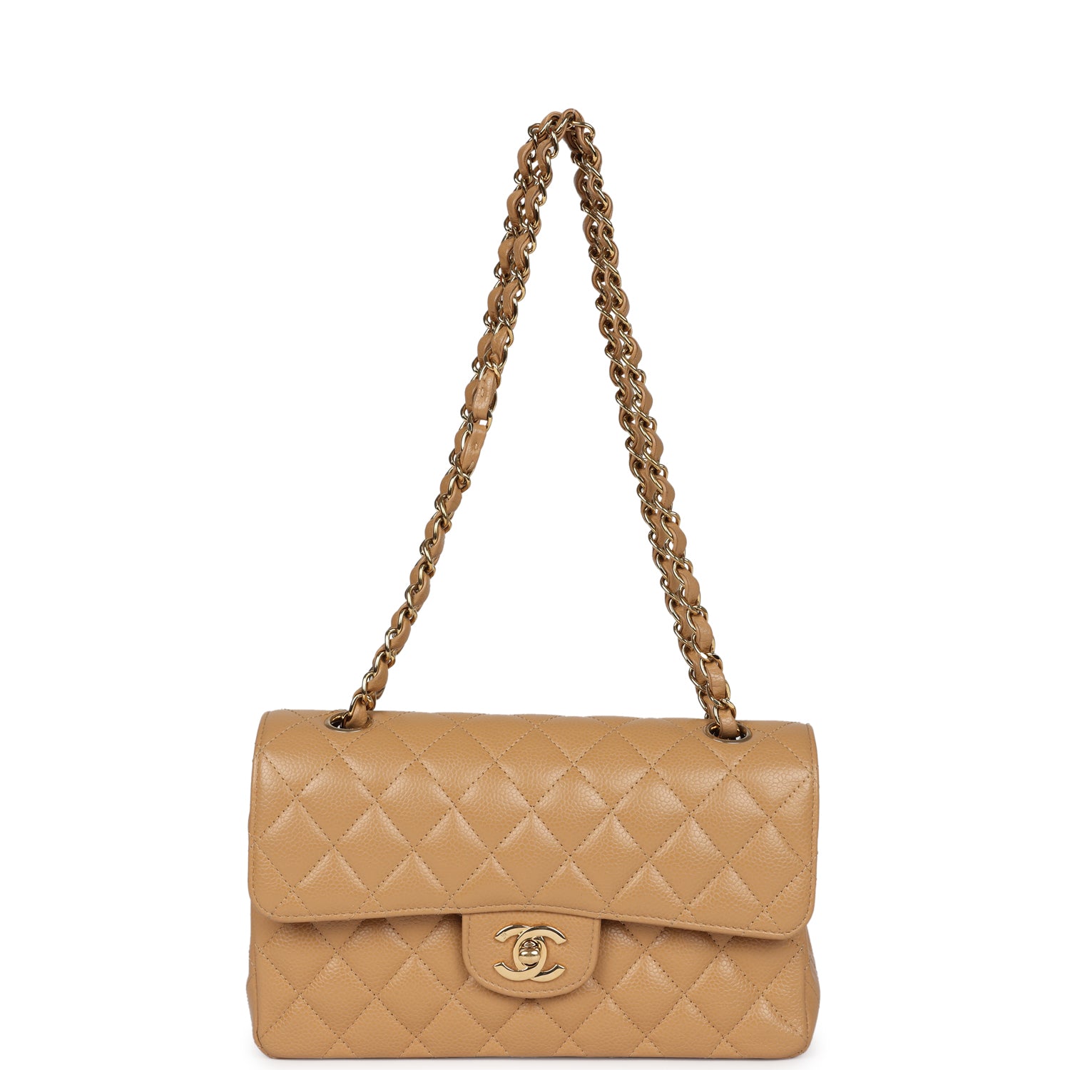 Small Classic Double Flap bag is in dark beige caviar leather with gold tone hardware and features a front flap with signature CC turnlock closure, half moon back pocket, and adjustable interwoven gold tone chain link and dark beige leather shoulder strap.