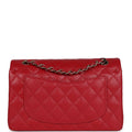 This Classic Double Flap bag is in red caviar leather with light gold tone hardware and features a front flap with signature CC turnlock closure, half moon back pocket, and adjustable interwoven light gold tone chain link and burgundy leather shoulder strap.