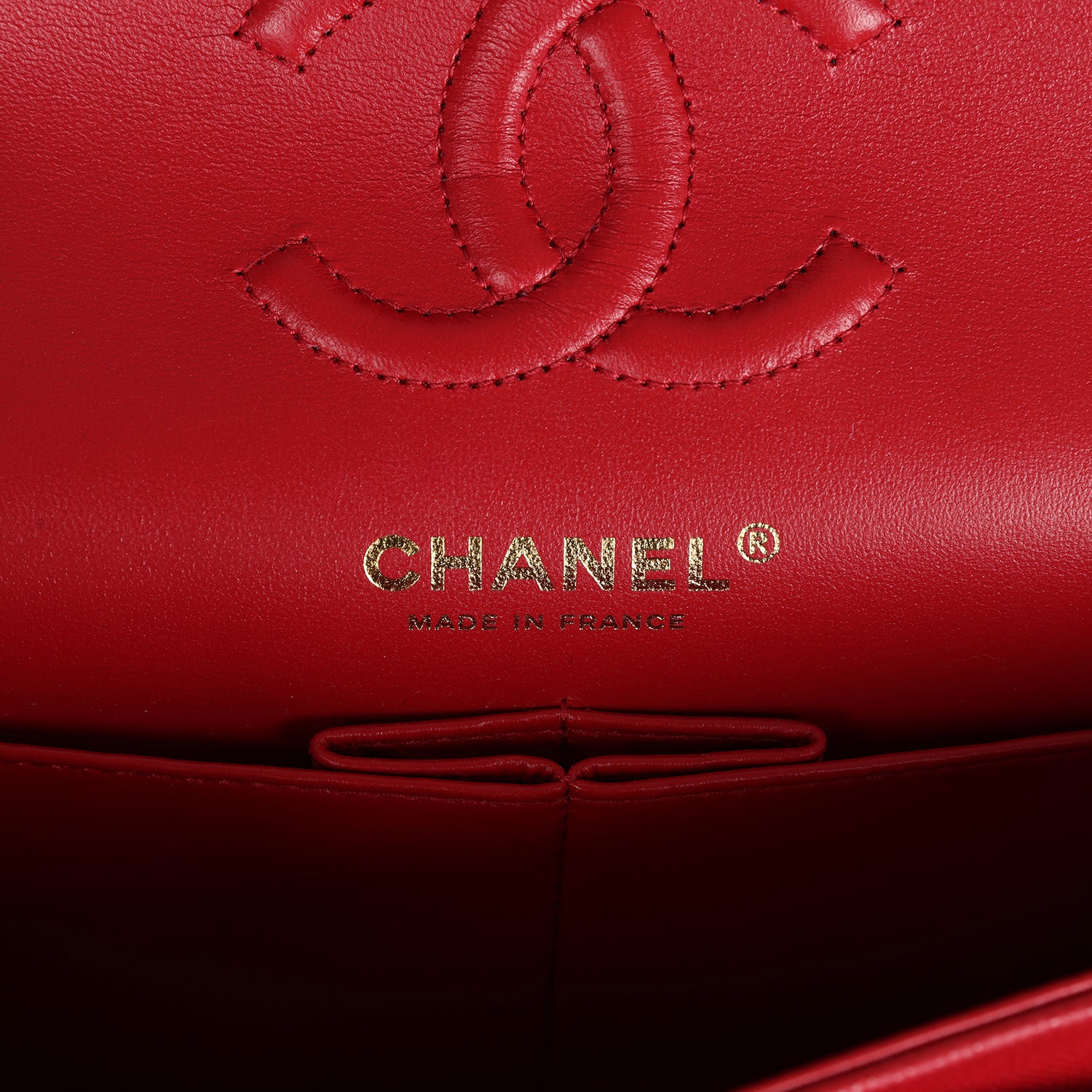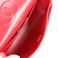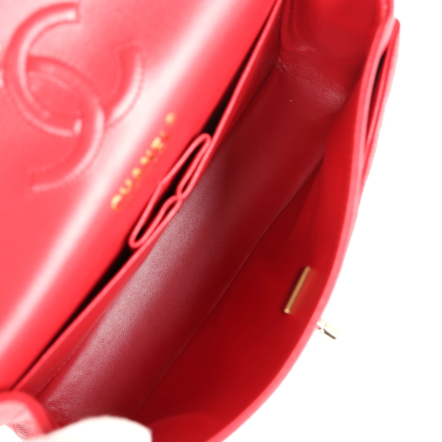 The interior is lined in red leather with the "love letter" zipper compartment underneath the first flap, an "outer" slit pocket under the second flap, and an interior compartment with two open pockets separated by a "lipstick" compartment.