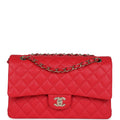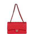 This Classic Double Flap bag is in red caviar leather with light gold tone hardware and features a front flap with signature CC turnlock closure, half moon back pocket, and adjustable interwoven light gold tone chain link and burgundy leather shoulder strap.