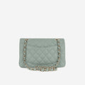 The Chanel Small Classic Flap in Sage Green Caviar leather features champagne gold hardware and a quilted design. It offers a compact, structured silhouette. by Prestige Totes’s experts, this handbag comes with dust bag only, available at our Brompton Road boutique and online.