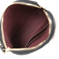 The interior is lined in burgundy fabric and has two interior card holder pockets.
