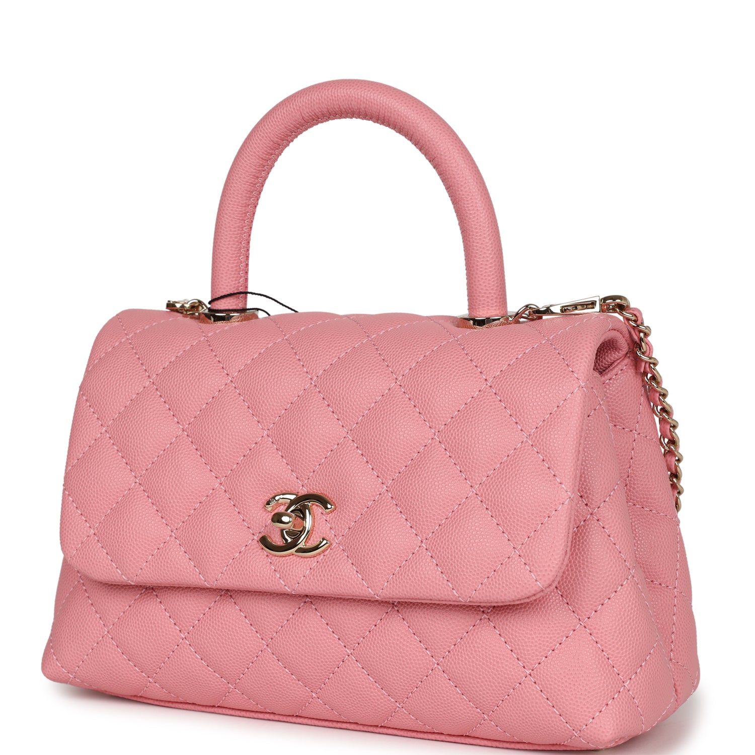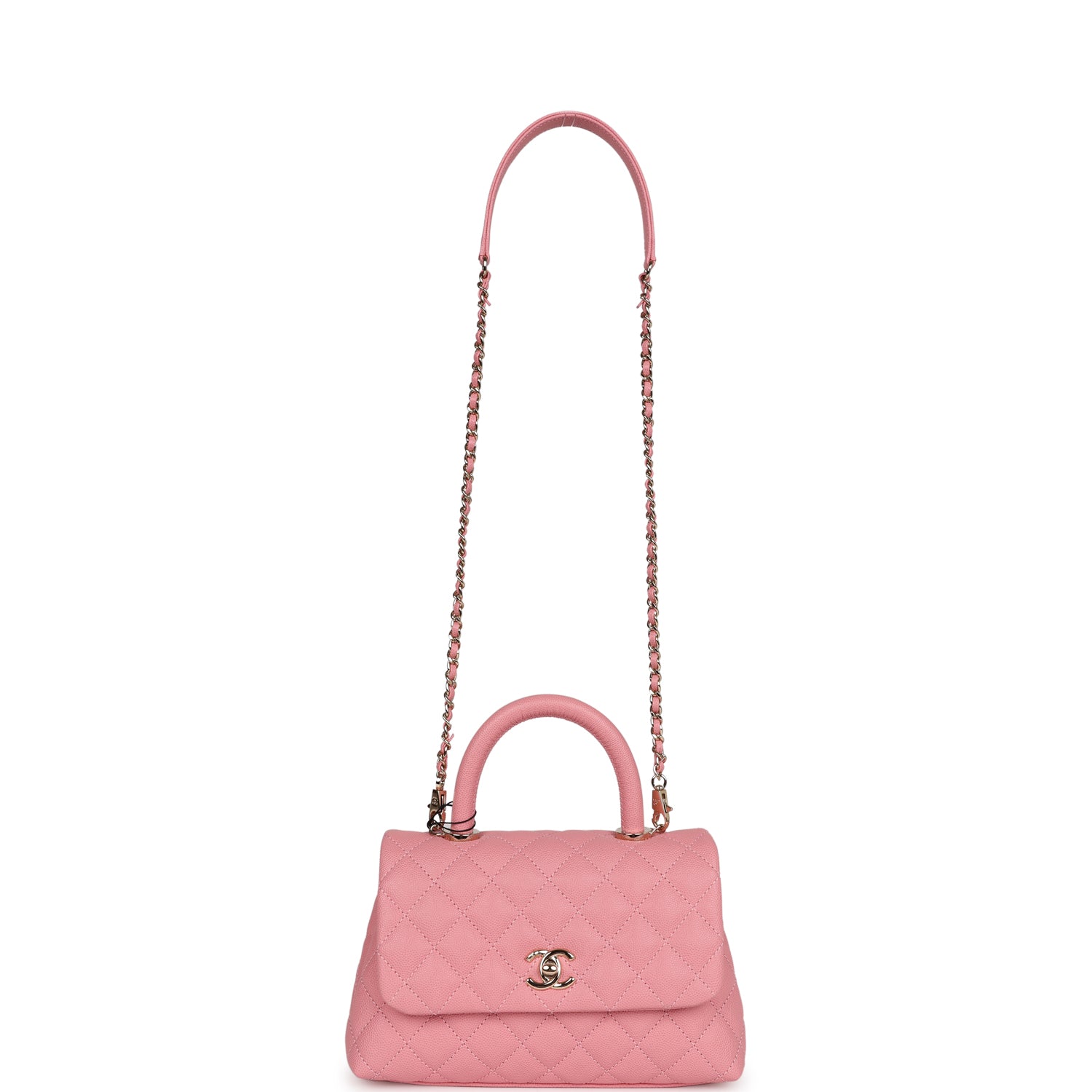 This Small Coco Handle Flap bag is of Dark Pink caviar with light gold tone hardware and has the signature diamond quilting in a trapezoidal shape with signature CC interlocking closure, top handle, and long light gold tone and pink leather chain.