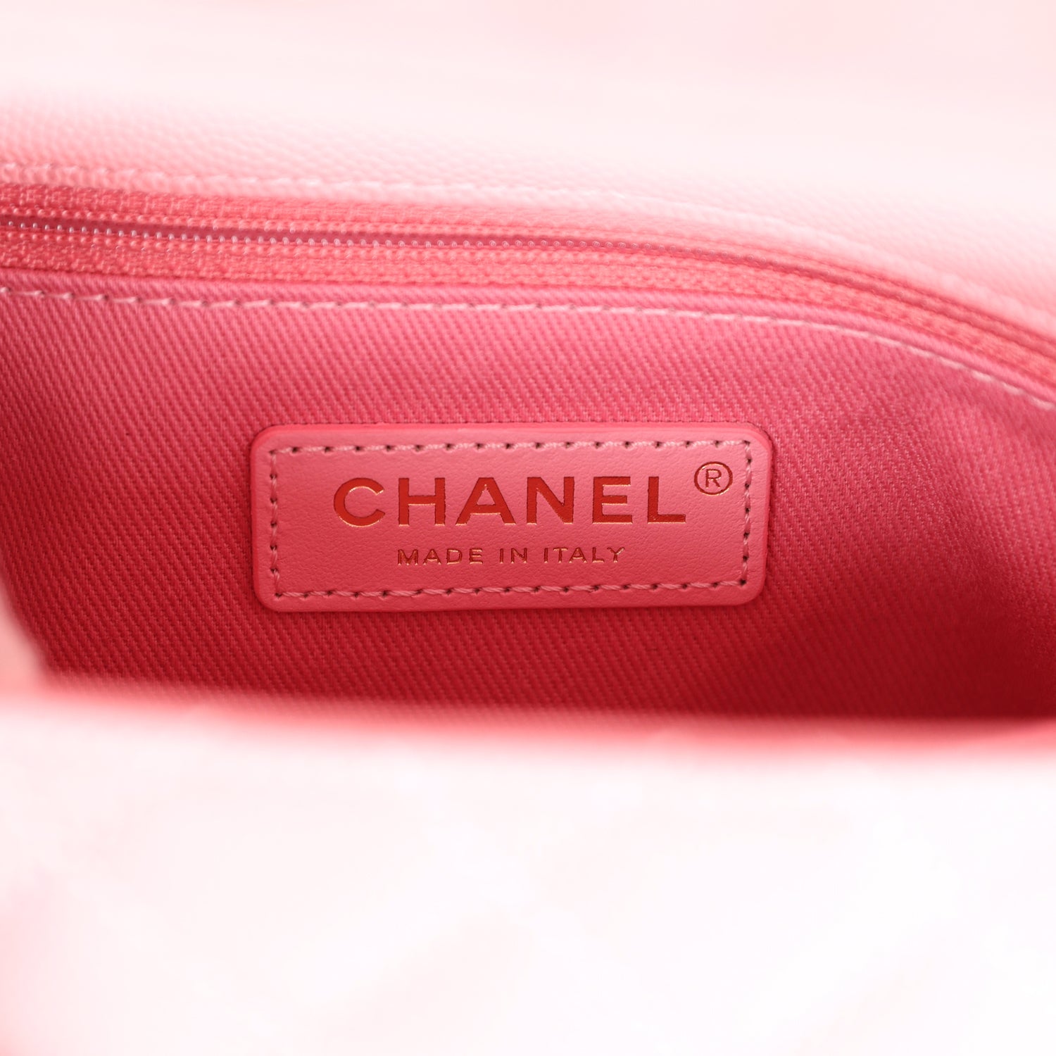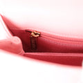 The interior is lined in pink leather with one zip pocket on the rear wall and one center divide slip pocket.