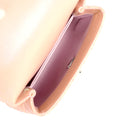 The interior is lined in light pink leather with one zip pocket on the rear wall and one center divide slip pocket.
