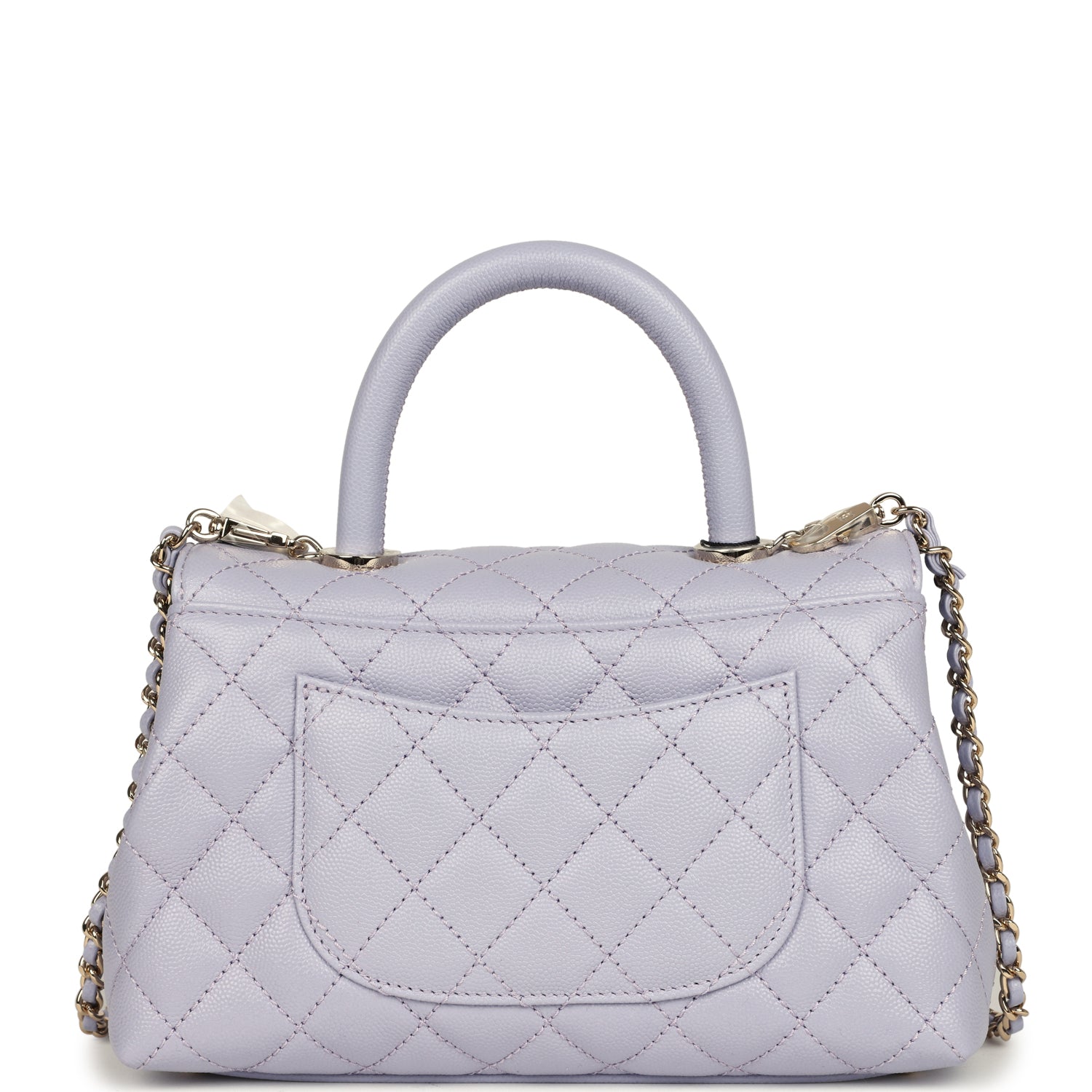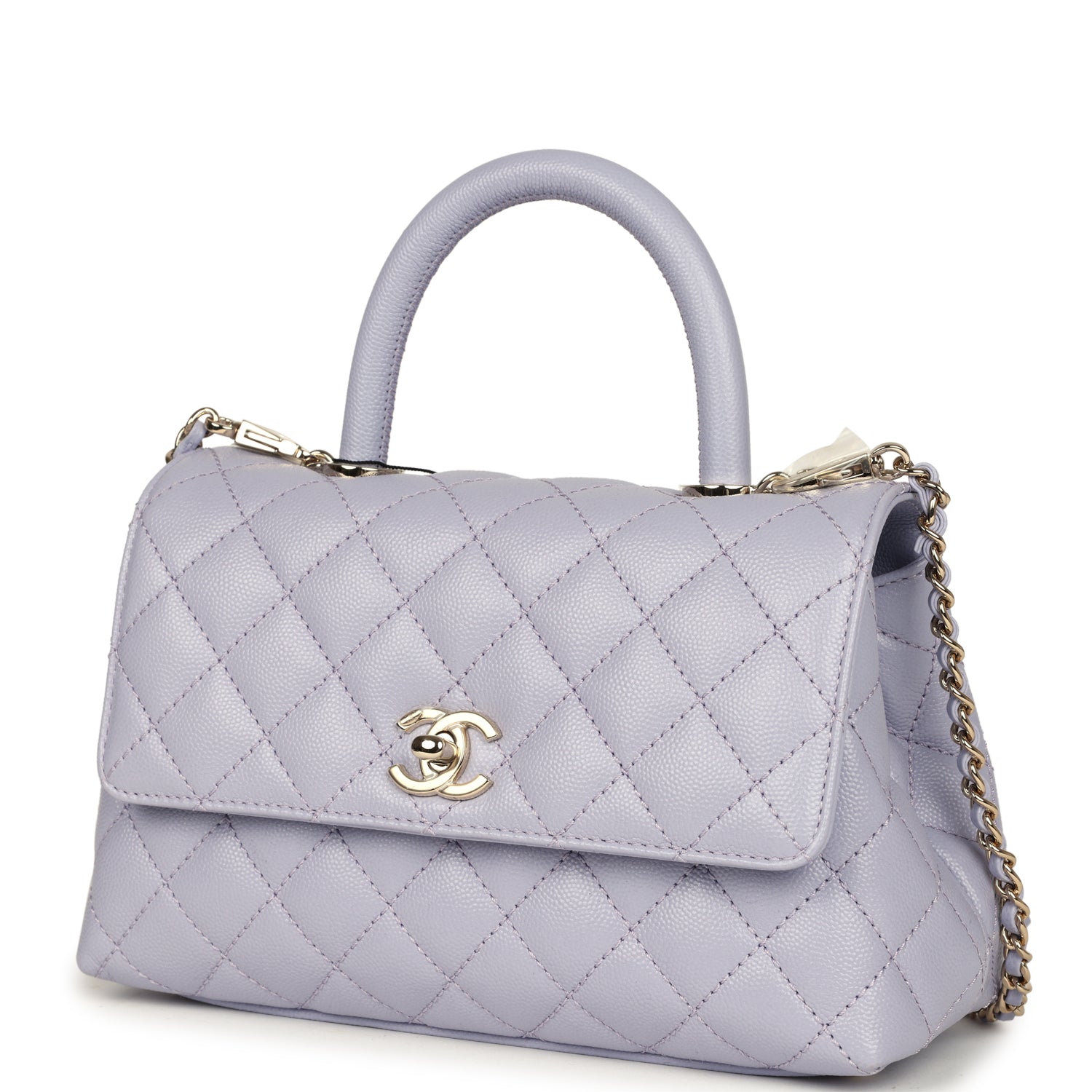 This small Coco Top Handle Flap Bag is of light purple quilted caviar leather with light gold hardware, with a signature CC interlocking closure in light gold, a leather top handle, and a long light gold tone and light purple leather chain,with a halfmoon back pocket.