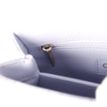 The interior is lined in light purple leather with one zip pocket on the rear wall and one center divide slip pocket.