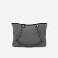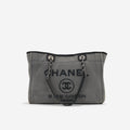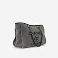 Elevate your everyday style with the Chanel Medium Deauville Tote, a casual icon reimagined with a touch of sparkle. Crafted from durable grey denim this tote features the signature “Chanel” and “31 Rue Cambon Paris” logo embroidered in black sequins, adding a subtle shimmer to the bag’s structured silhouette.