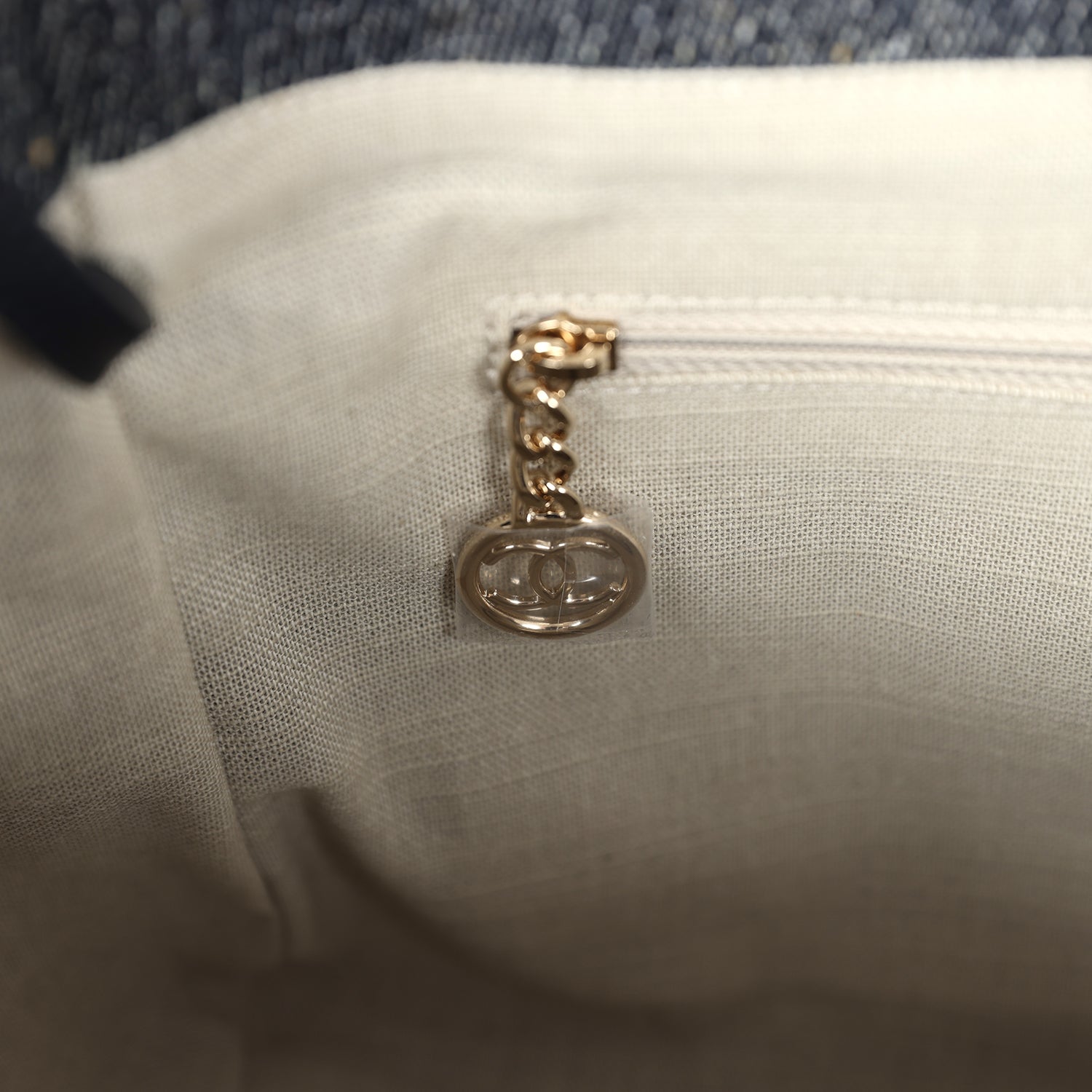 This small Chanel Deauville shopping bag is in dark blue and white denim with light gold hardware, featuring a large CC signature and Chanel logo on the front, removable pouch, two rolled top handles, and two interwoven light gold chain link and dark blue leather shoulder straps.