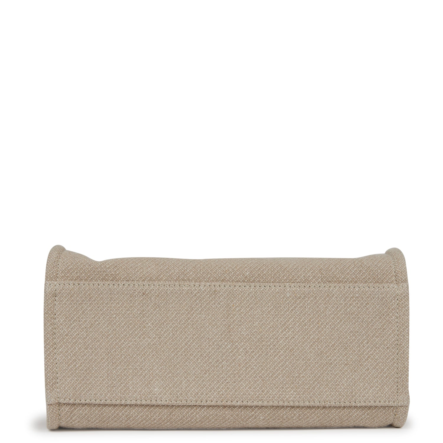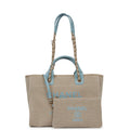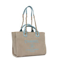 This small Deauville bag is made of beige boucle fabric with light gold tone hardware; featuring a large CC signature and Chanel logo on the front, removable pouch and interwoven light gold tone chain link and blue leather shoulder straps.