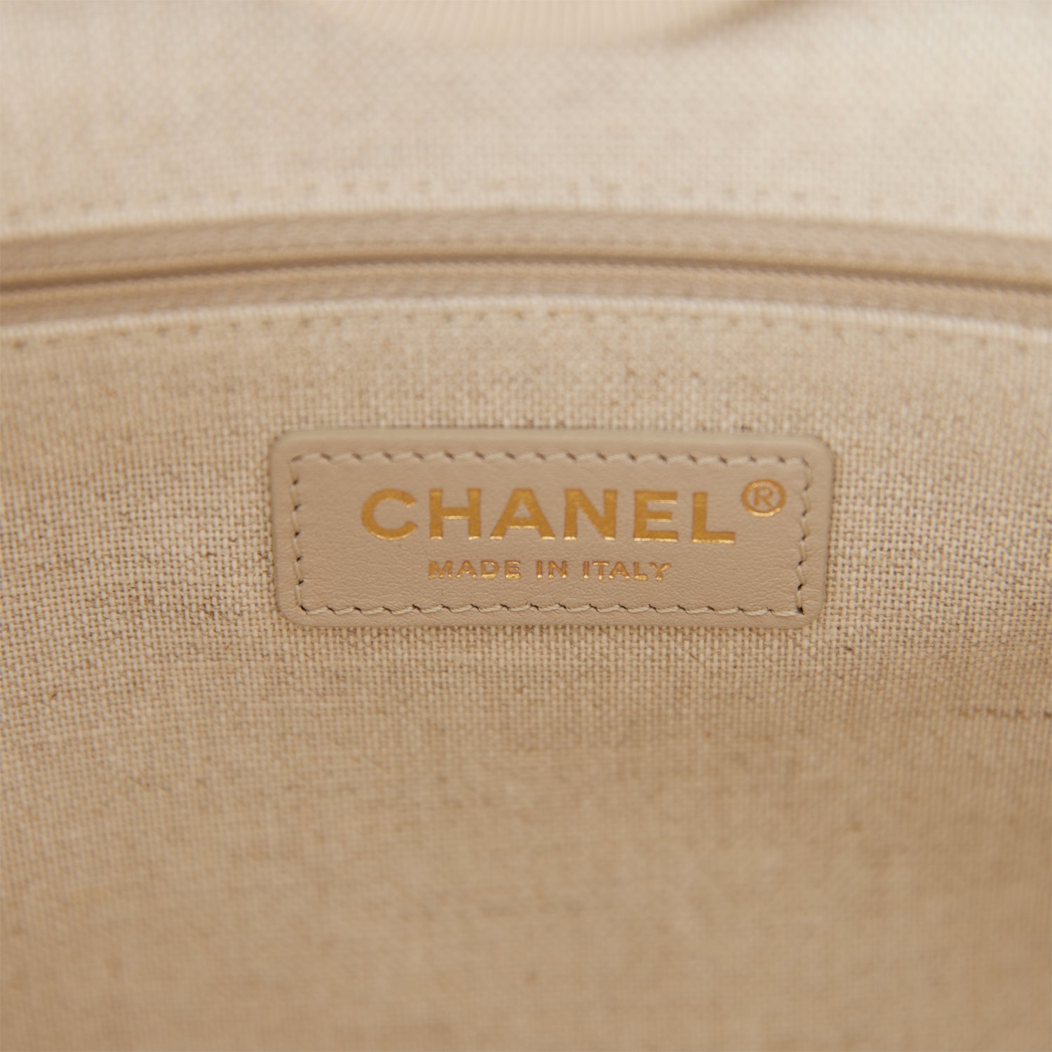 The interior is lined in beige fabric and has two open pockets on the front wall and a zipper pocket with a Chanel pull on the rear wall.