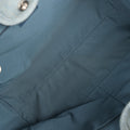 The interior is lined in blue fabric and has two open pockets on the front wall and a zipper pocket with a Chanel pull on the rear wall.