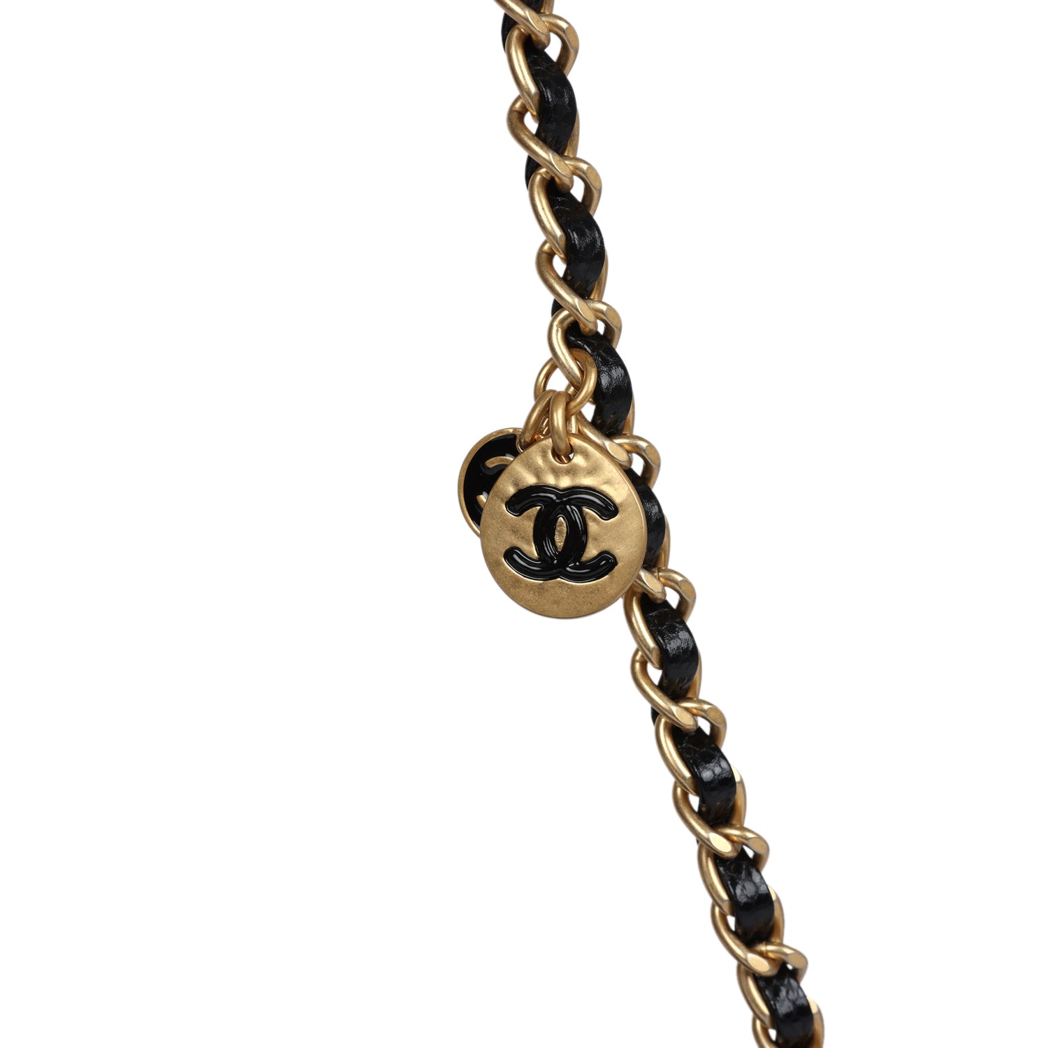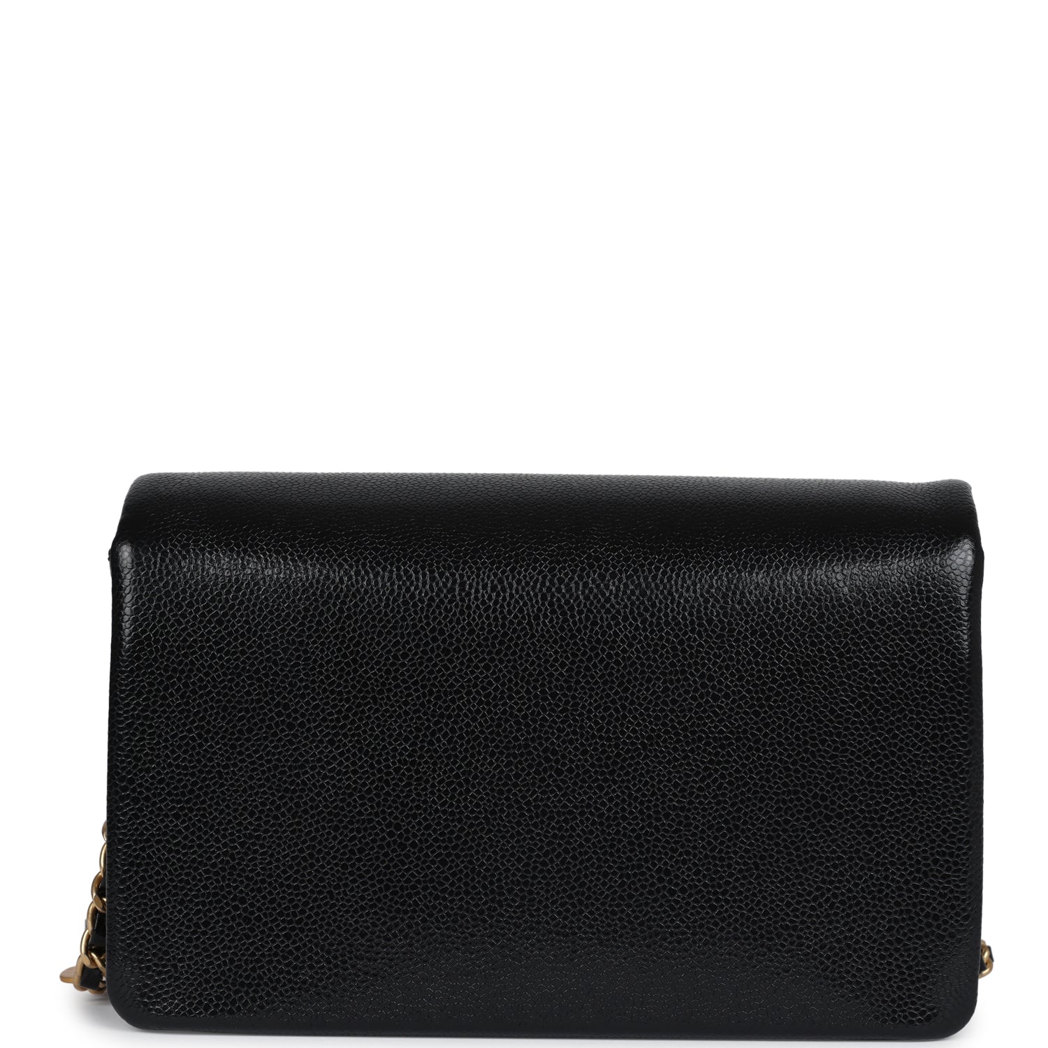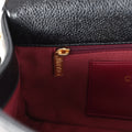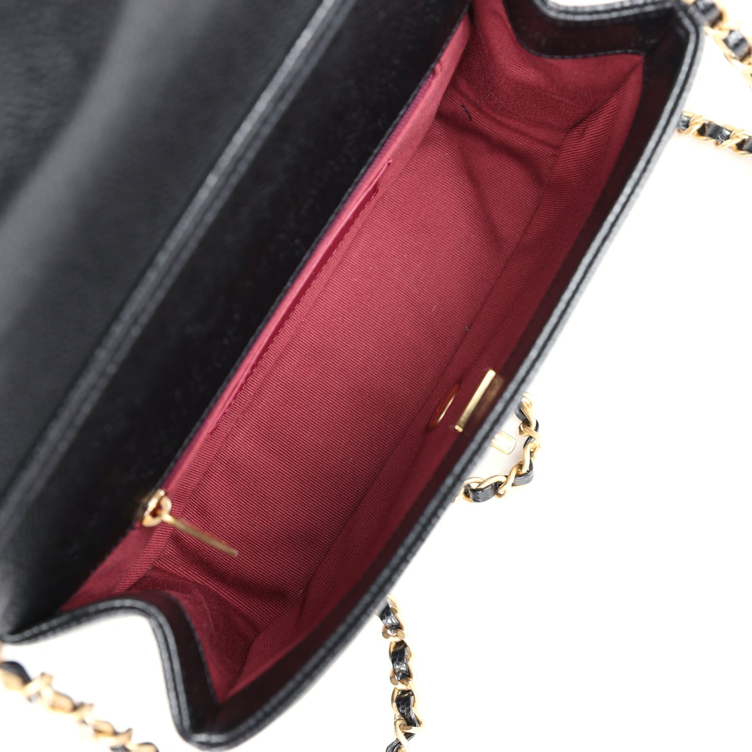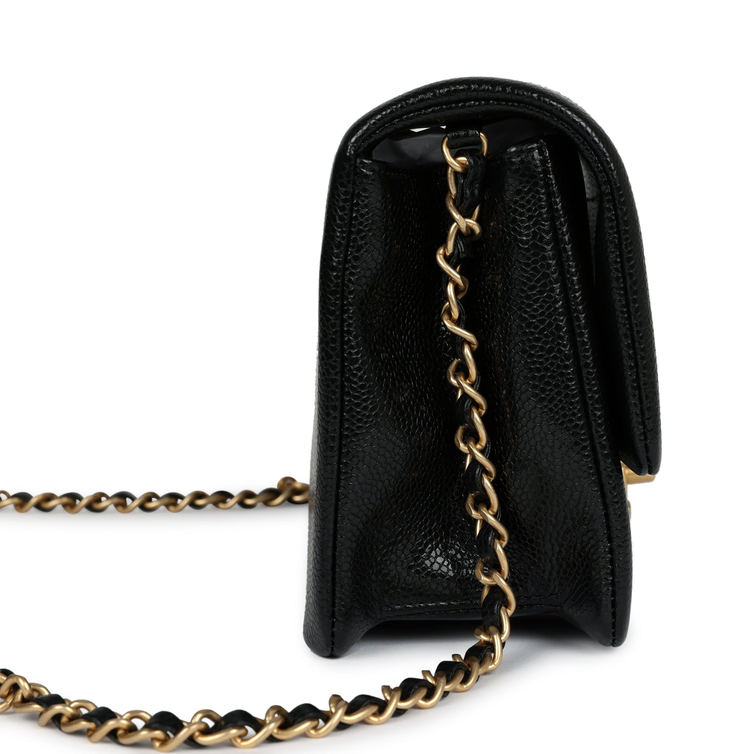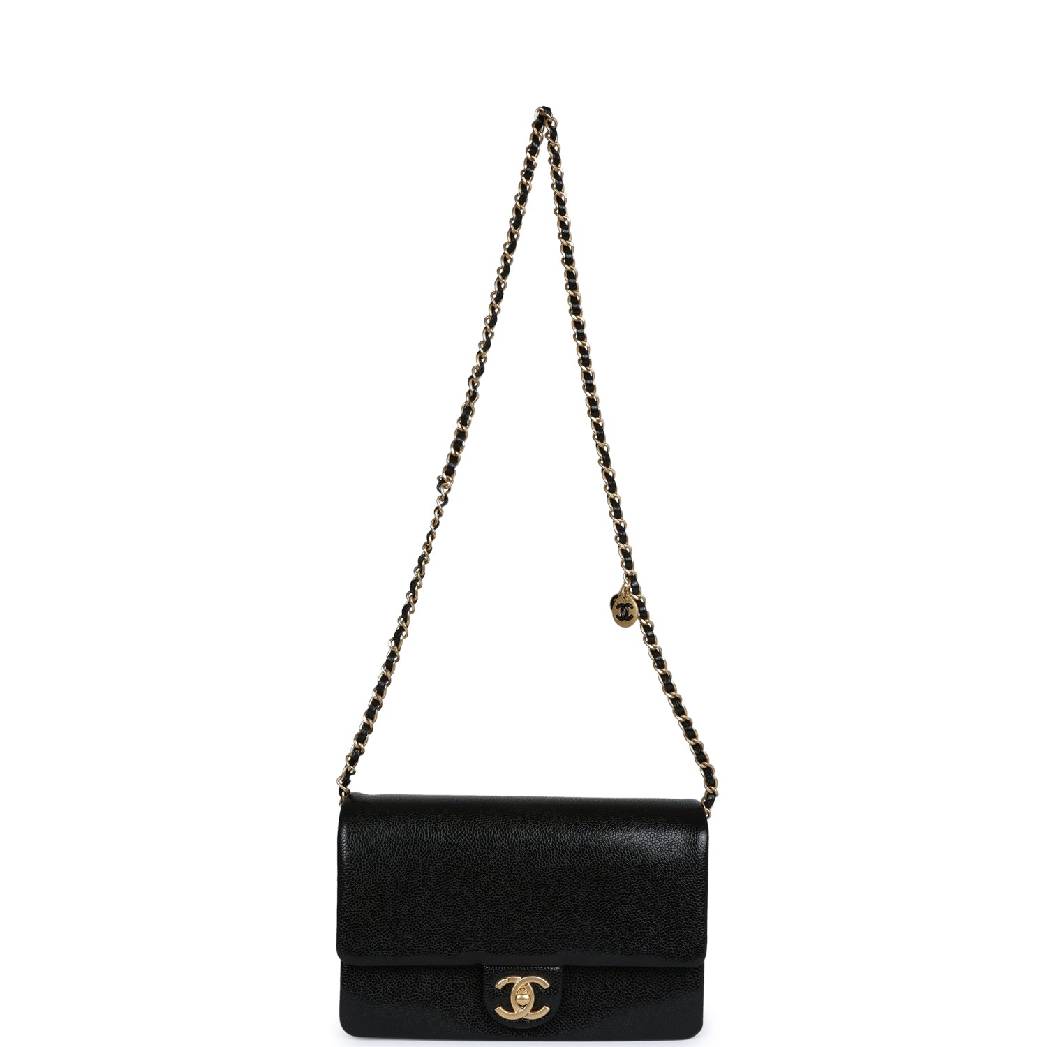 This Chanel small flap bag is of black grained shiny calfskin leather with brushed gold hardware, featuring, a front flap CC turnlock closure and a single interwoven brushed gold and black leather shoulder strap with two round CC coin charms.
