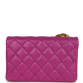 This Chanel Small Crush Flap Bag is in Purple Quilted Shiny Aged Calfskin with Brushed Gold Hardware, features a trio-accordion style shape, tonal stitching, and CC turnlock closure, and a brushed gold tone chainlink crush adjustable shoulder/crossbody strap.