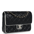 This Chanel Small Graphic Frame Flap Bag is of black lambskin leather with light gold tone hardware, featuring contrast white leather edge piping, a front flap with a light gold tone and white enamel CC turnlock closure, half moon back pocket and an interwoven light gold tone chainlink and leather crossbody/shoulder strap.