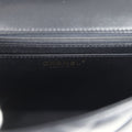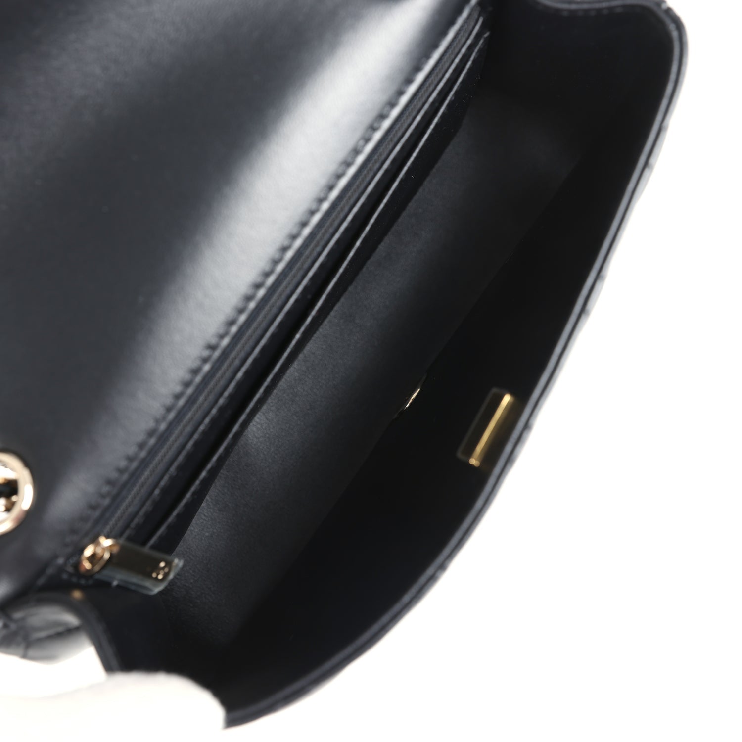 The interior is lined in black leather and features one zip pocket on the rear wall with logo pull, inside one slit pocket