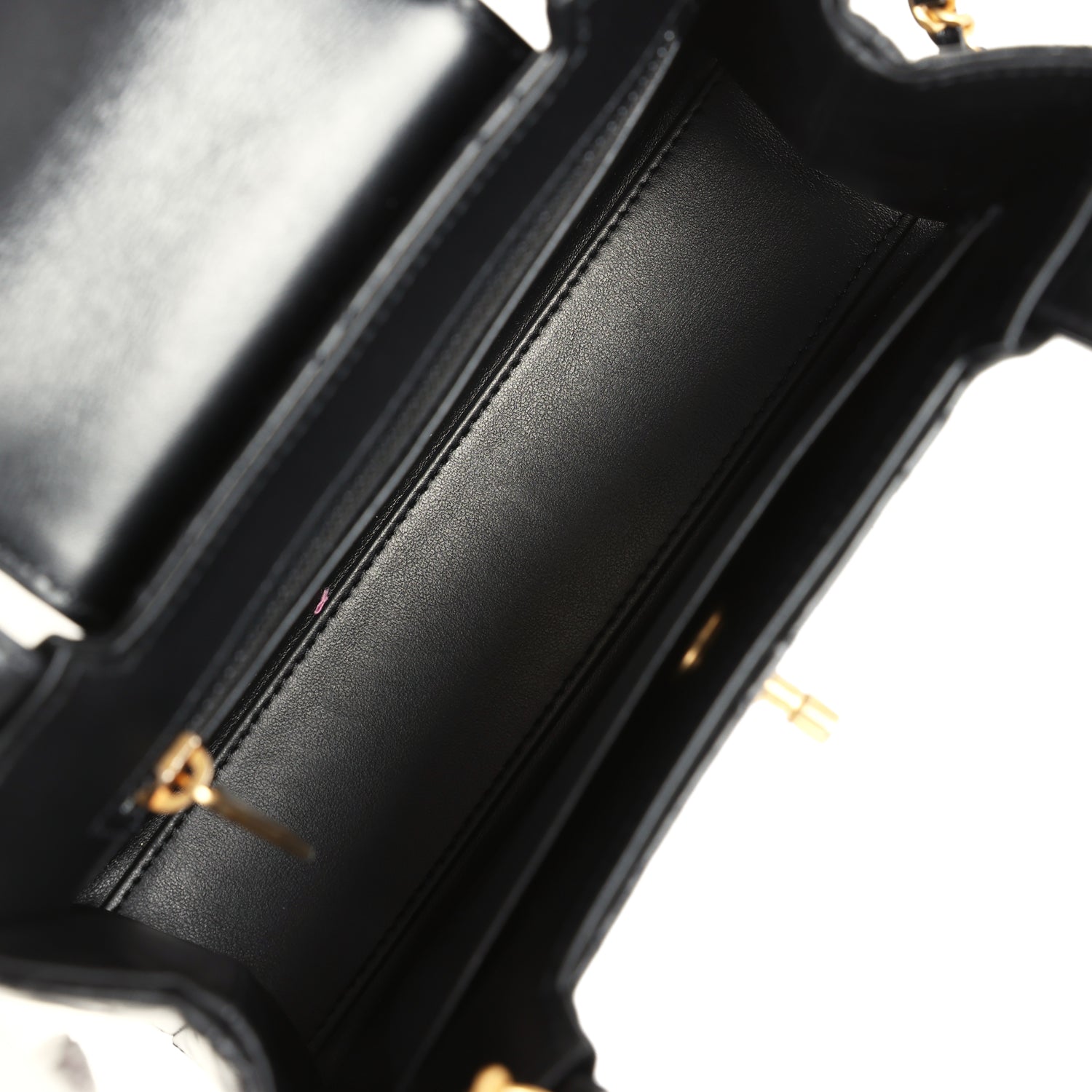 This small Kelly is in black shiny aged calfskin with brushed gold hardware, tonal stitching, two flat back top handles, interwoven brushed gold and black leather shoulder strap, and the signature CC turnlock closure.