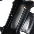 This Small Kelly is in black shiny aged calfskin with brushed gold hardware, tonal stitching, two flat back top handles, interwoven brushed gold and black leather shoulder strap, and the signature CC turnlock closure.