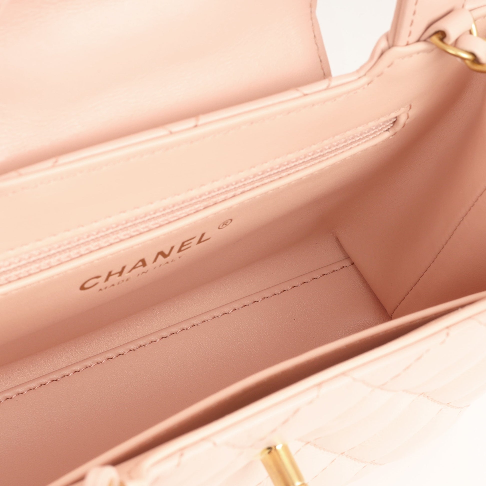 Compact yet functional, the structured silhouette features a single top handle for ladylike elegance and a detachable leather-interwoven chain strap, offering versatile wear from day to evening. The signature twist-lock closure and CC detail nod to Chanel’s rich heritage, while the softly grained calfskin ensures durability and a refined finish.