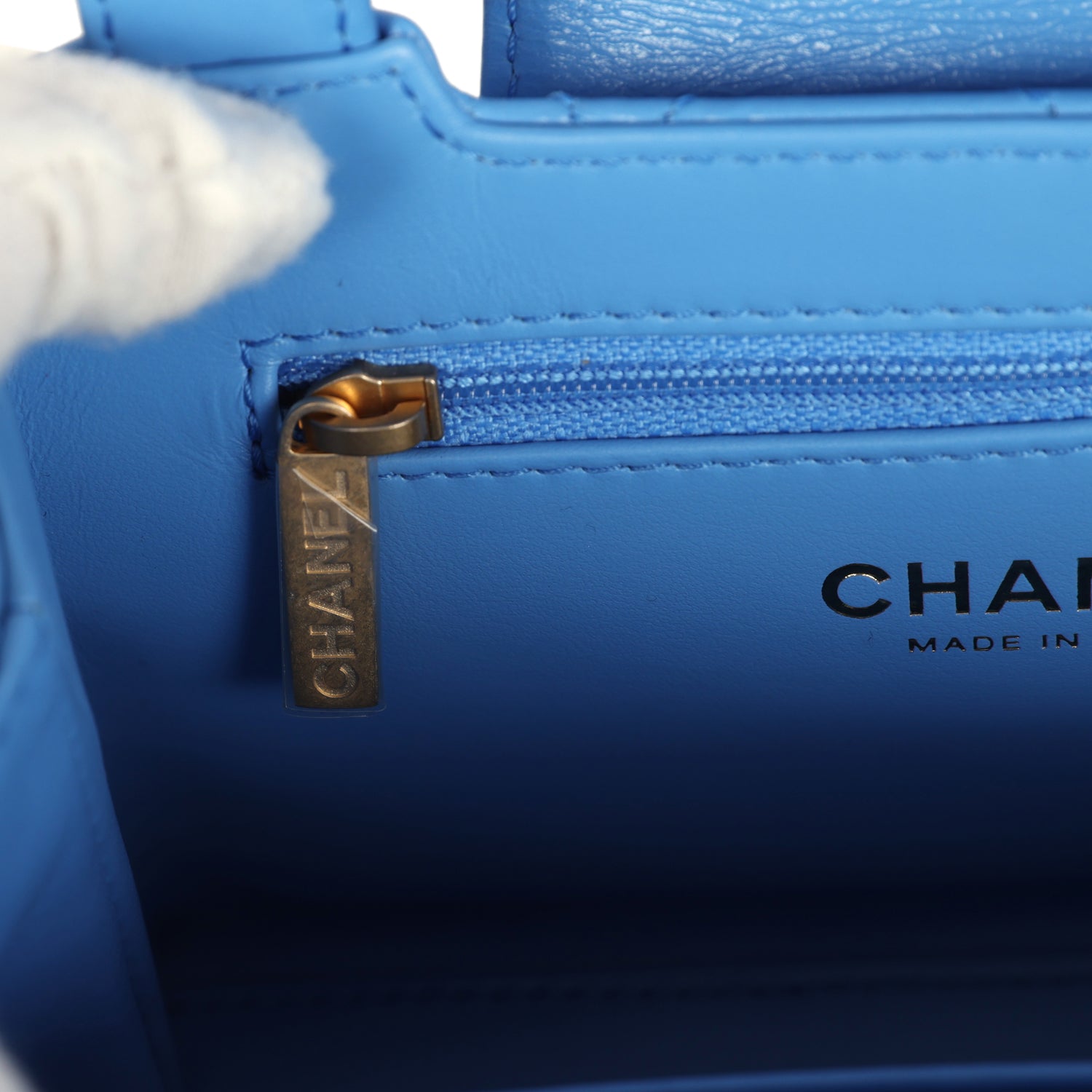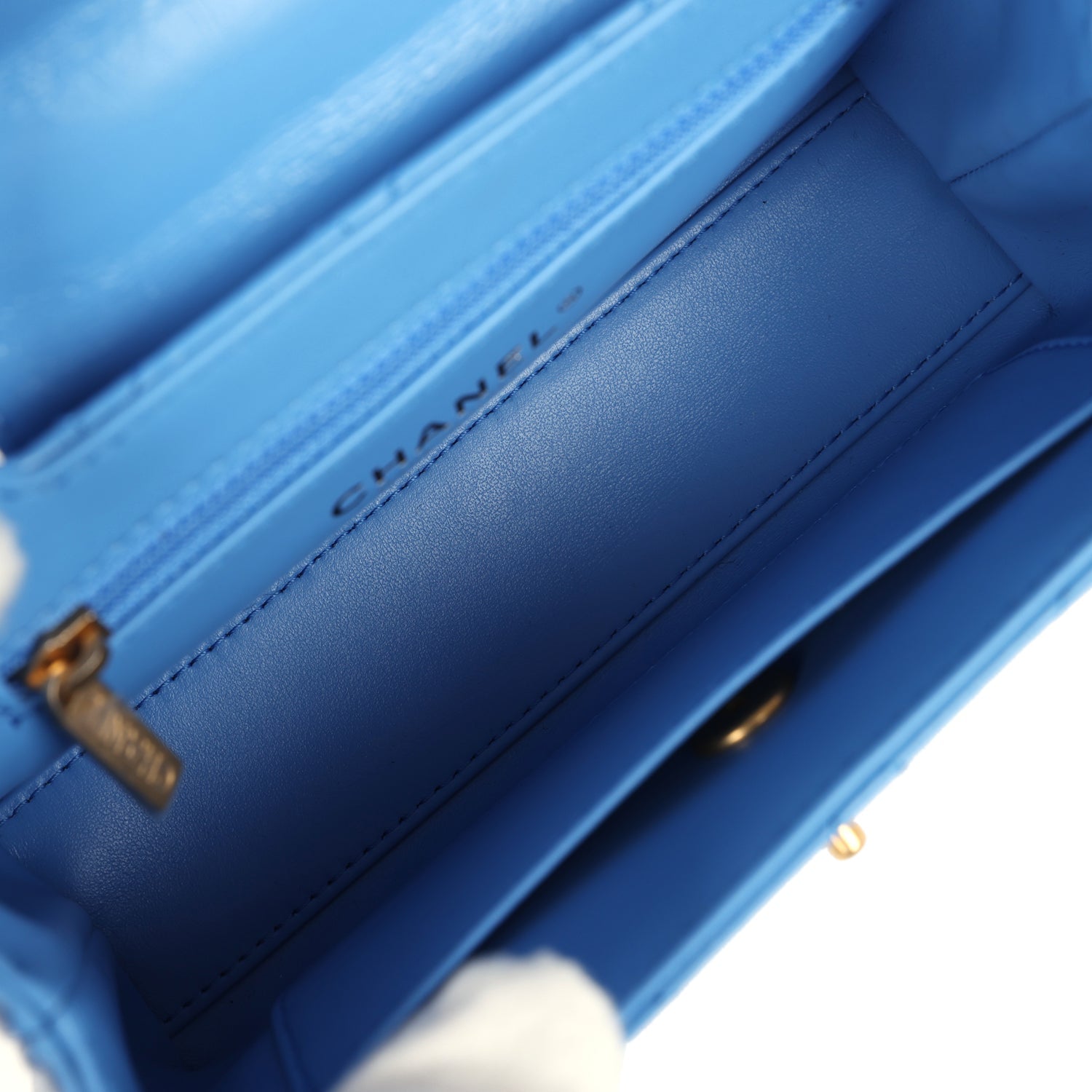 The interior is lined in blue leather with one zip pocket on the rear wall and one center divide slip pocket.