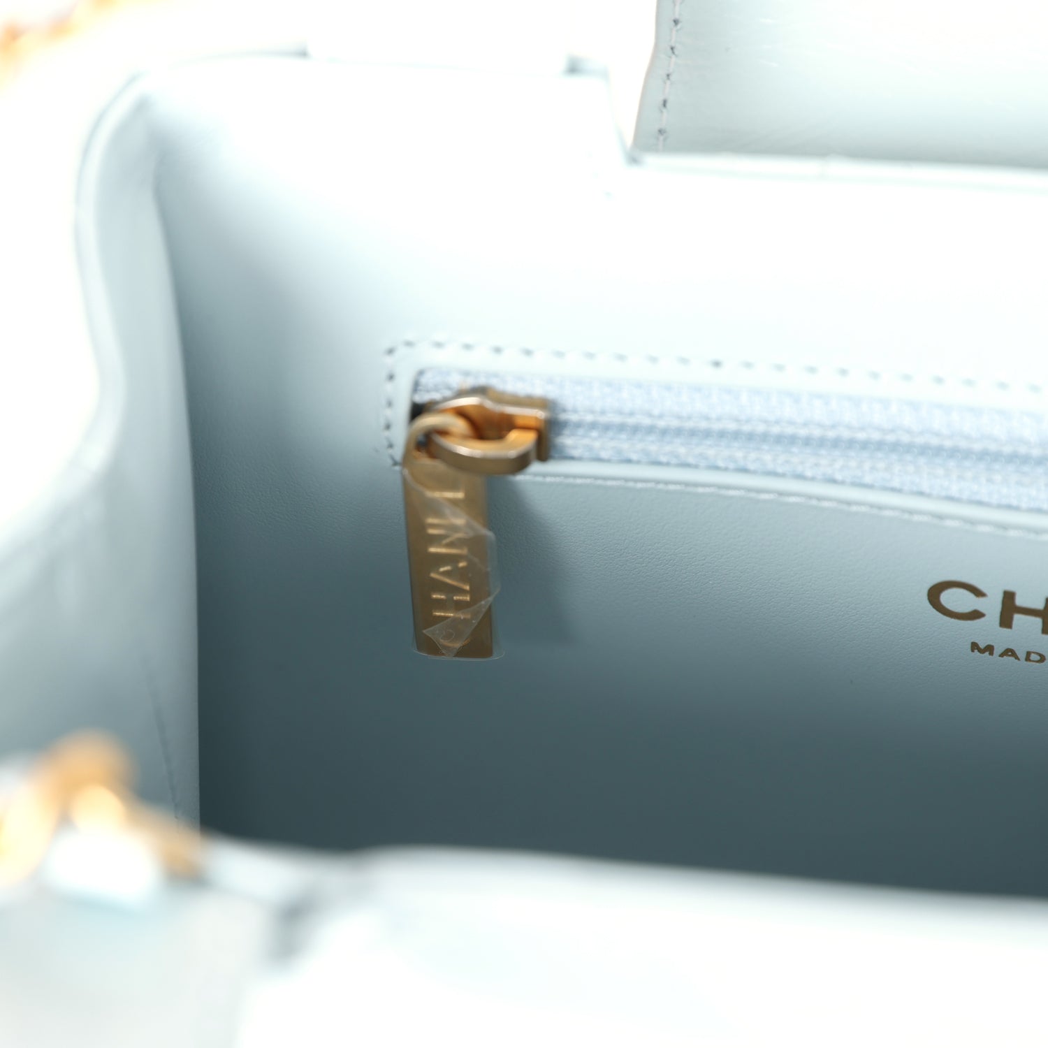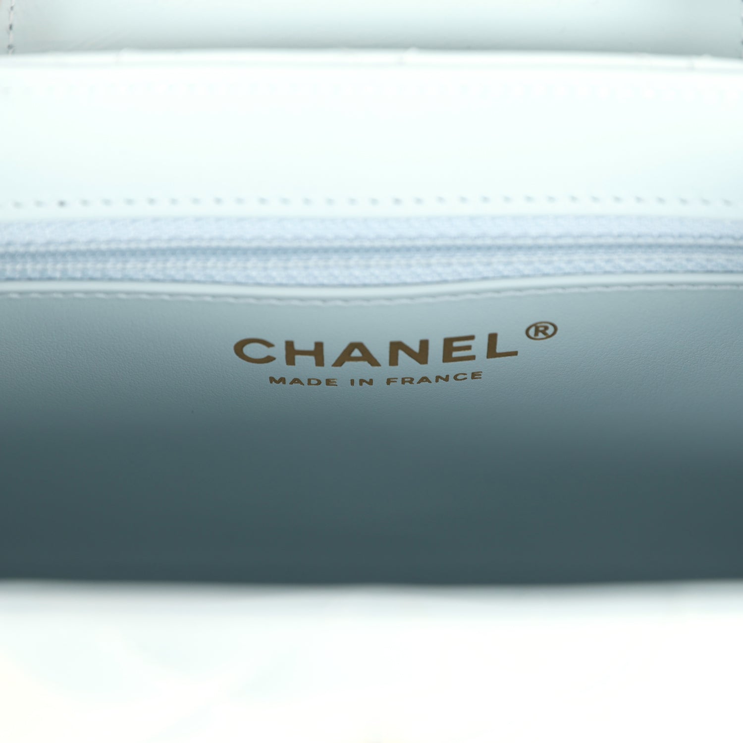 The interior is lined in light blue leather with one zip pocket on the rear wall and one center divide slip pocket.