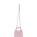 The interior is lined with light pink leather and has one zipper and one slip pocket.
