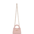 The interior is lined with light pink leather and has one zipper and one slip pocket.