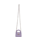 This nano Kelly is in light purple shiny aged calfskin with brushed gold hardware, tonal stitching, two flat back top handles and an interwoven brushed gold with light purple leather shoulder strap, and CC turnlock closure.