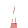 The interior is lined with dark pink leather and has one zipper and one slip pocket.