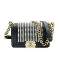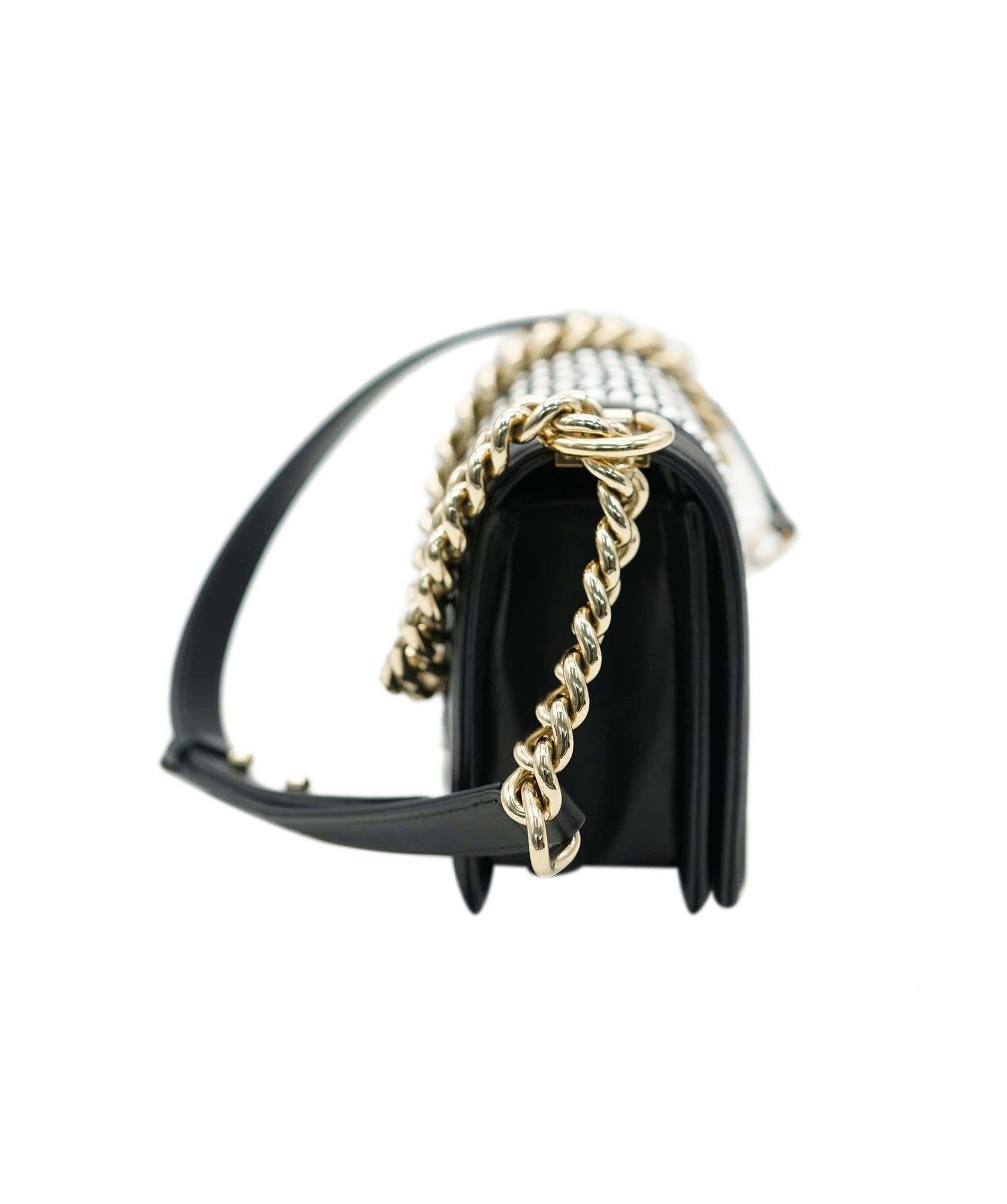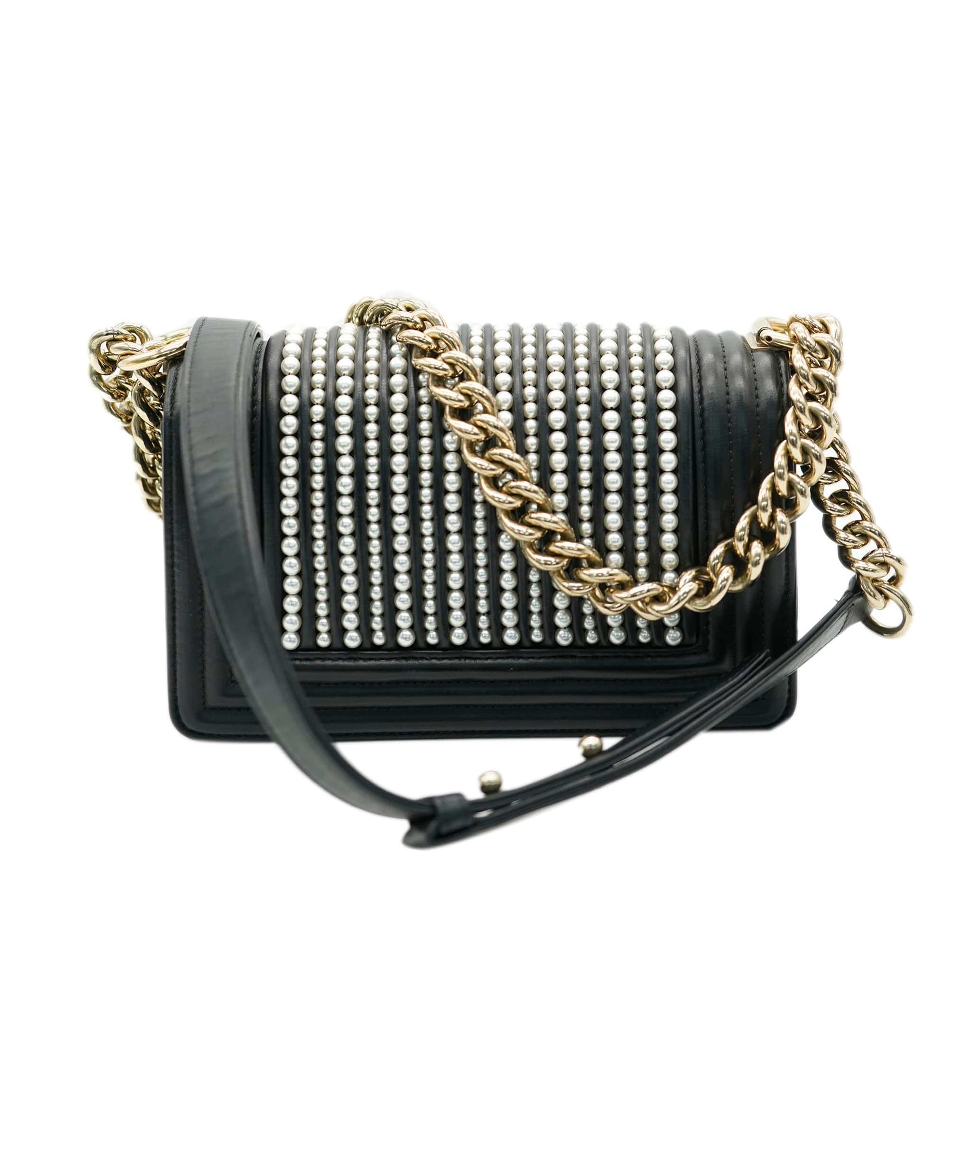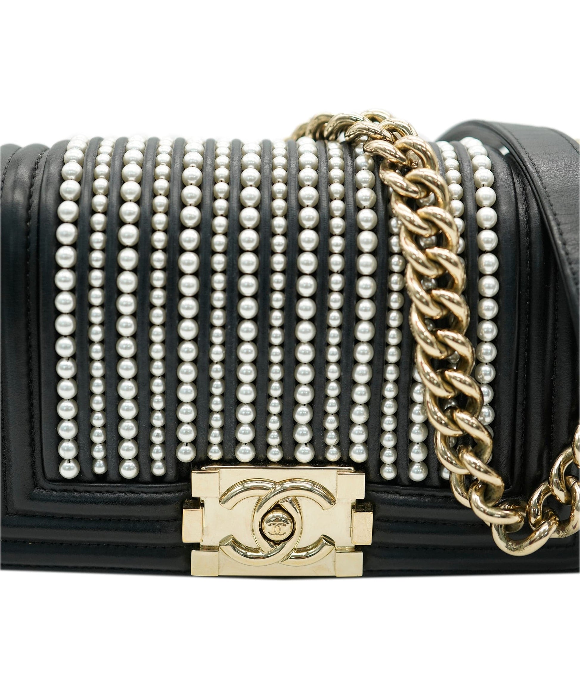 Description: Shop this beautiful rare Chanel small pearl black boy bag. Serial number is 28822730. Comes full set.