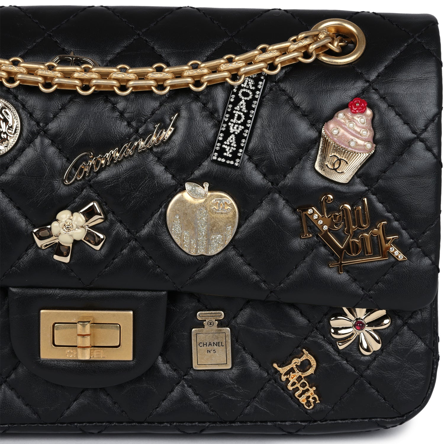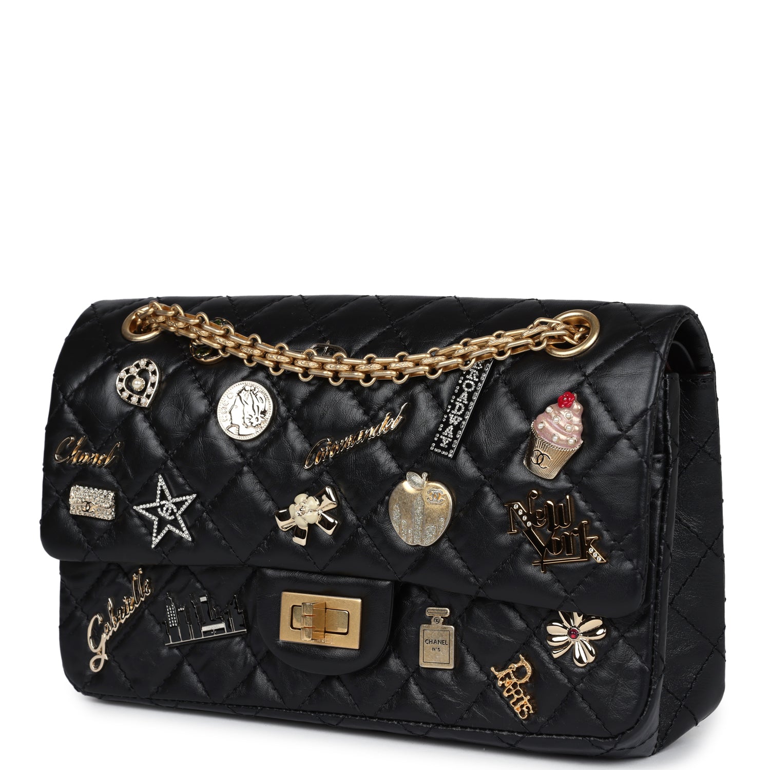 This Limited Edition "57th Street New York" Chanel Small Reissue 225 2.55 Lucky Charms Double Flap in black aged calfskin leather with antique gold hardware, features a mixture of Chanel's iconic charms and various charms that represent NYC all over the front of bag.