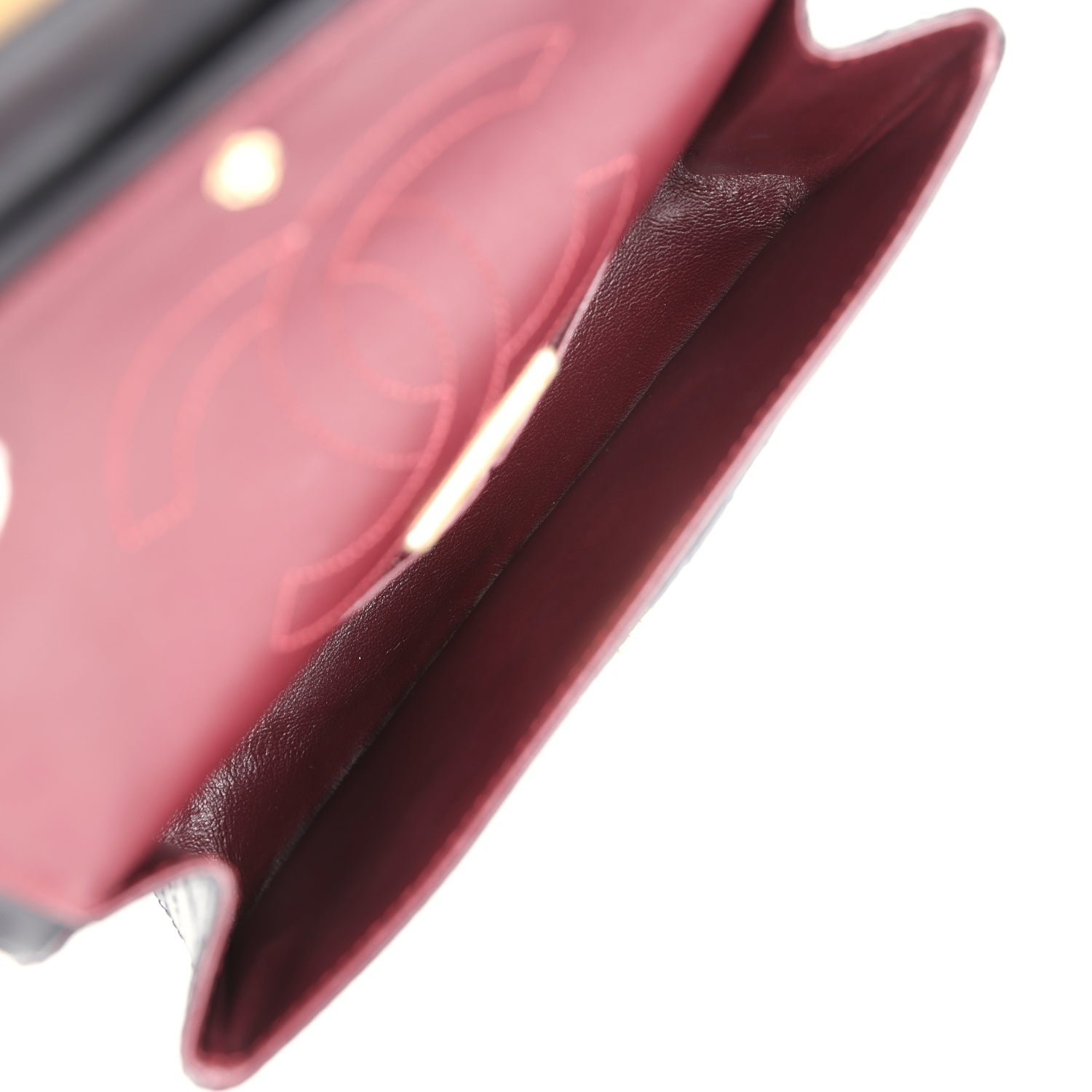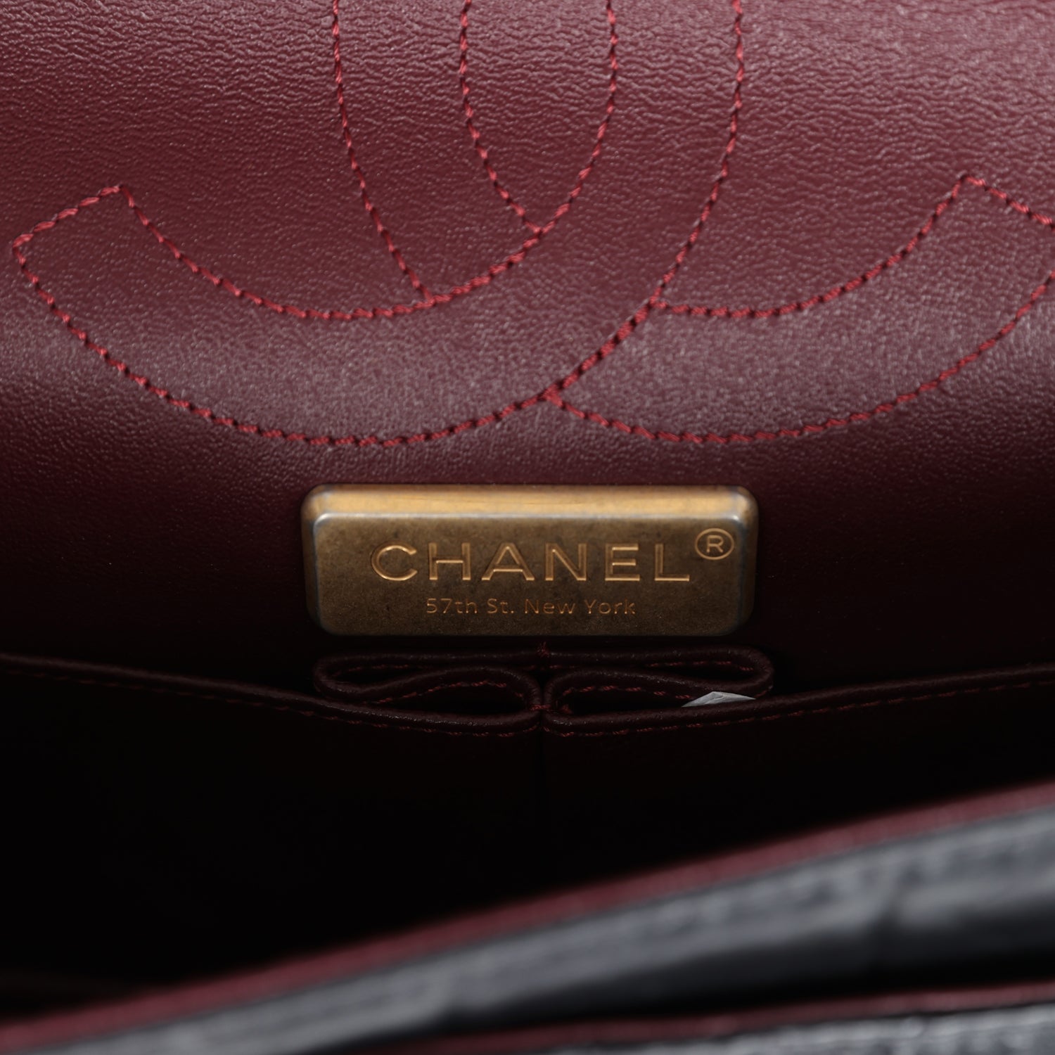 Opens to reveal an inner flap, a front pocket, and a black and burgundy leather interior with patch pockets with halfmoon pocket on back of bag, and features an antique gold reissue chain shoulder strap and a matching Mademoiselle turn-lock closure. Underneath the first flap, there is a small zipper compartment, and under the second flap there is an "outer" slit pocket and inside two open pockets separated by a "lipstick" compartment.