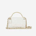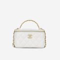 Primarily developed for storing your tiny beauty essentials and other small necessities, the vanity case has come a rather long way since its birth. With the “mini bag” remaining at the forefront of fashion accessory trends, this petite piece is the farthest thing from just a functional case. This beautiful vanity on chain is crafted in ivory lambskin leather and complimented with gold-tone hardware.