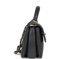 This small trendy CC bag is in Dark Grey lambskin leather with light gold tone hardware and has a front flap with signature CC turnlock closure, rear half moon pocket, single interwoven dark grey leather and light gold tone chain link shoulder/crossbody strap and top handle.