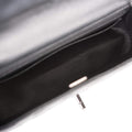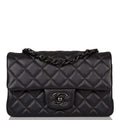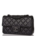 This Mini Rectangular flap bag is of black lambskin leather with black hardware and has a front flap with signature CC turnlock closure, rear half moon pocket, single interwoven black leather and black chain link shoulder/crossbody strap.