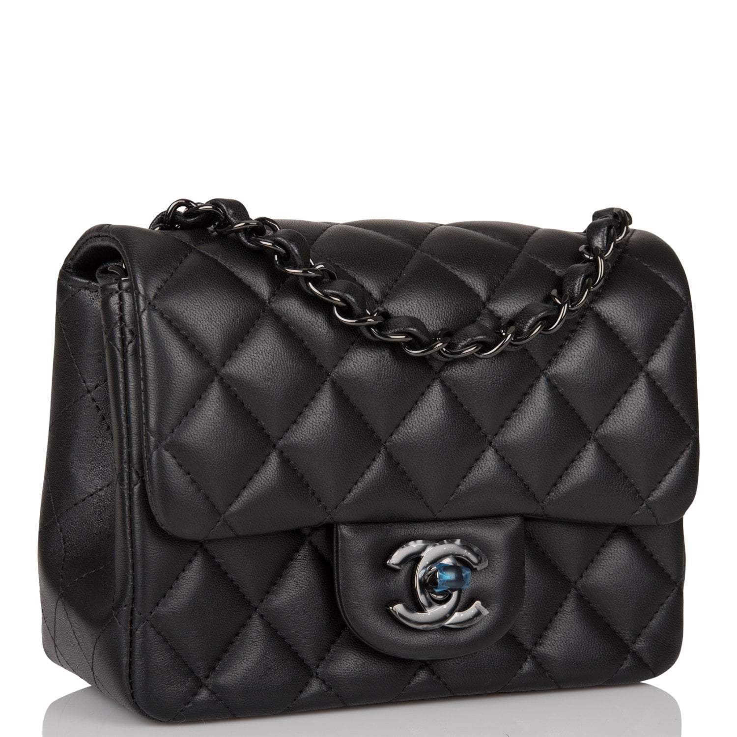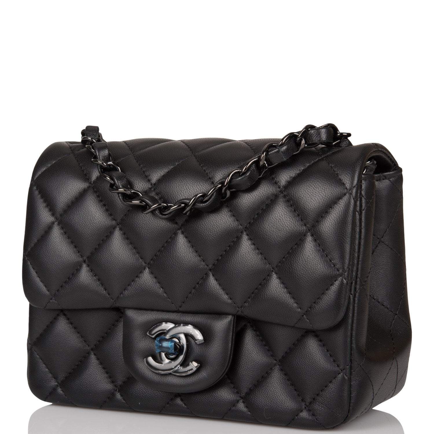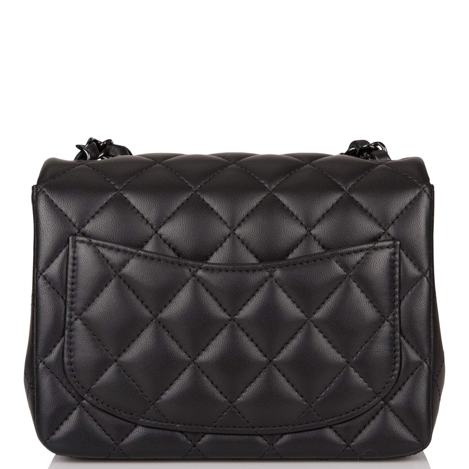This Mini Square flap bag is in black lambskin with black hardware and has a front flap with signature CC turnlock closure, rear half moon pocket and single interwoven black leather and black chain link shoulder/crossbody strap.