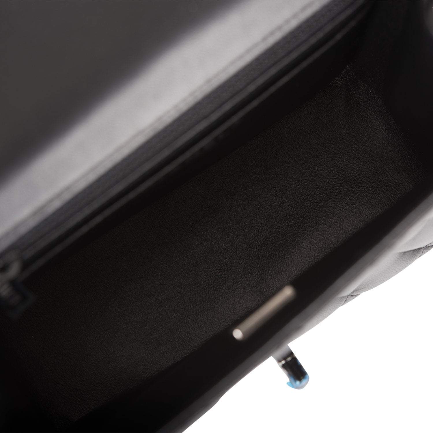 The interior is lined in black leather and features a zipper pocket with Chanel pull and an open pocket below.
