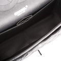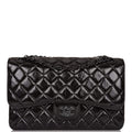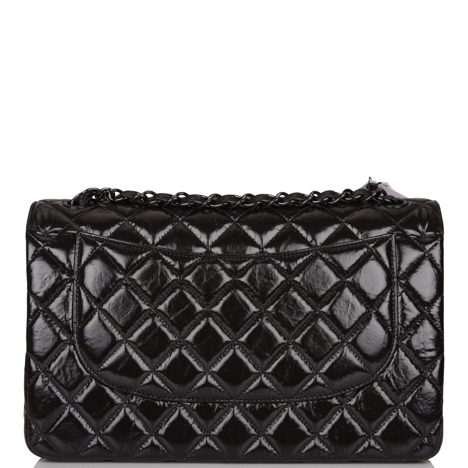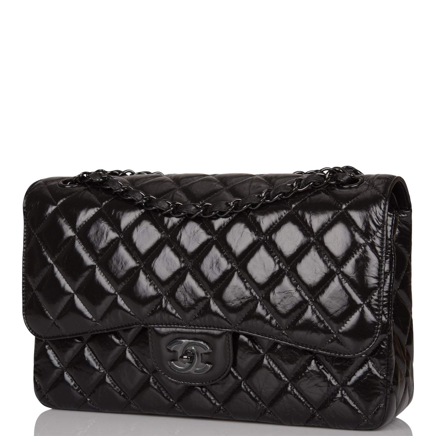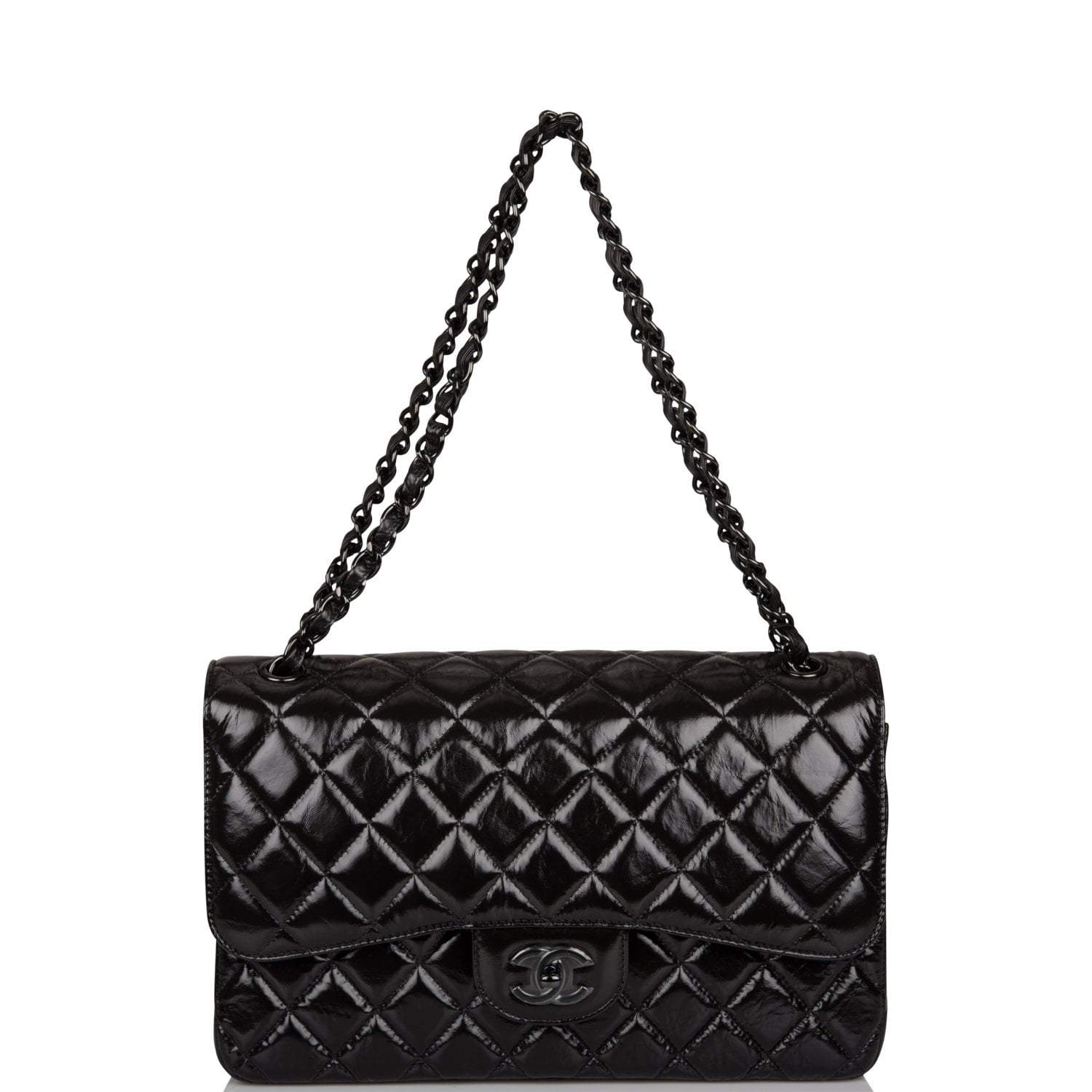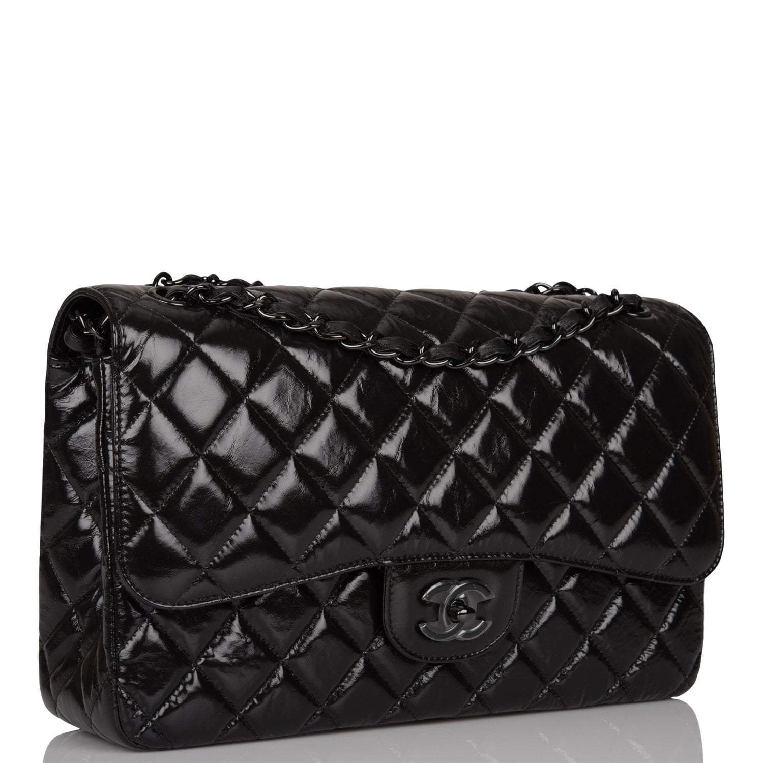 This Jumbo Classic Double Flap bag is in black shiny crumpled calfskin leather with black hardware and features a front flap with signature CC turnlock closure, half moon back pocket, and adjustable interwoven black chain link and black leather shoulder strap.