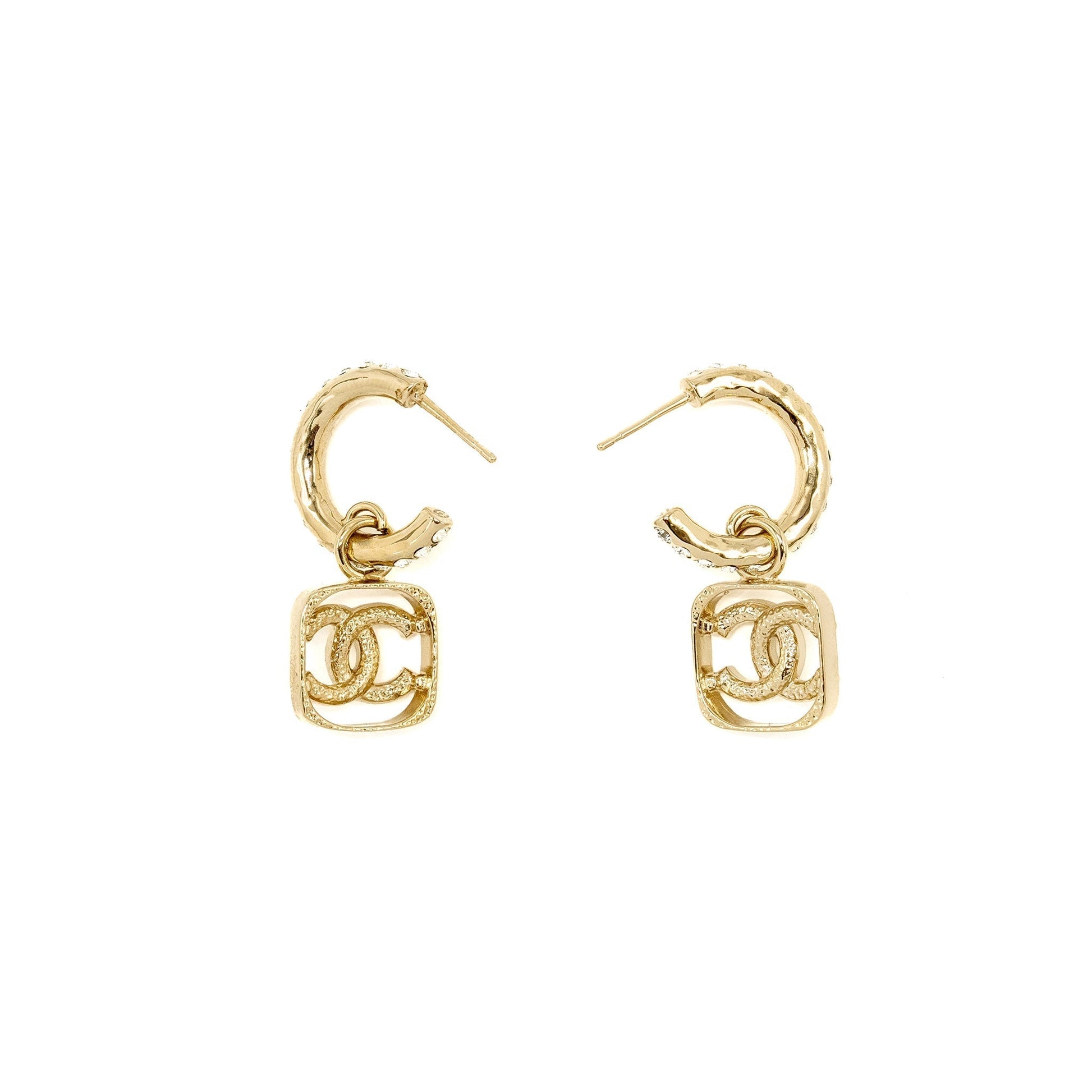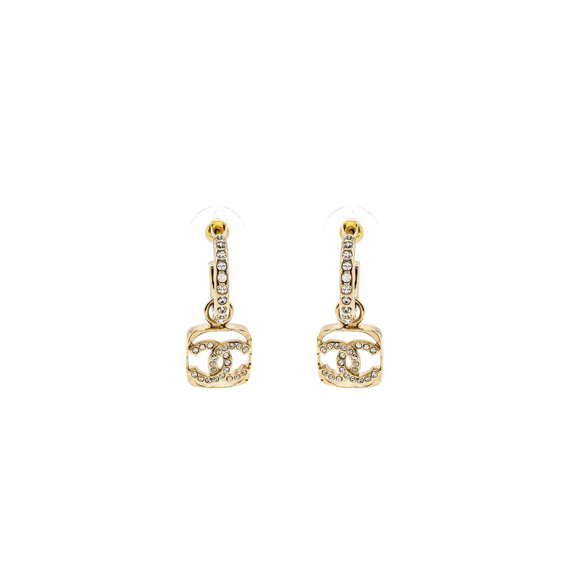 Chanel Square CC Logo Dropped Earrings Crystal Light Gold Tone