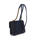 This Square Flap backpack is in Blue denim with antique gold tone hardware, a classic CC turnlock closure, a front slip pocket, a rear half moon pocket, an interwoven denim and chain top handle, and matching shoulder straps.