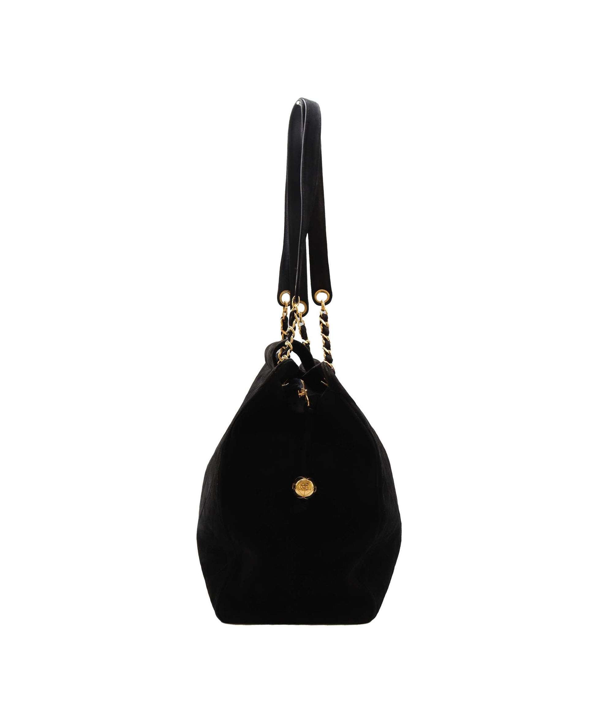 Shop this incredibly special and rare Chanel suede supermodel tote bag, crafted from black suede and finished with 24k gold gilded hardware. This bag is an iconic style which was designed in the 90's and was seen worn by all of the biggest Chanel runway supermodels.