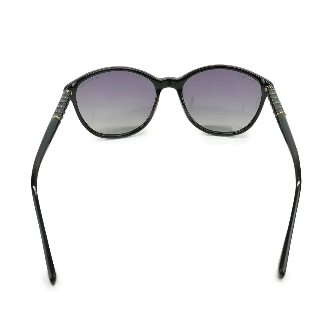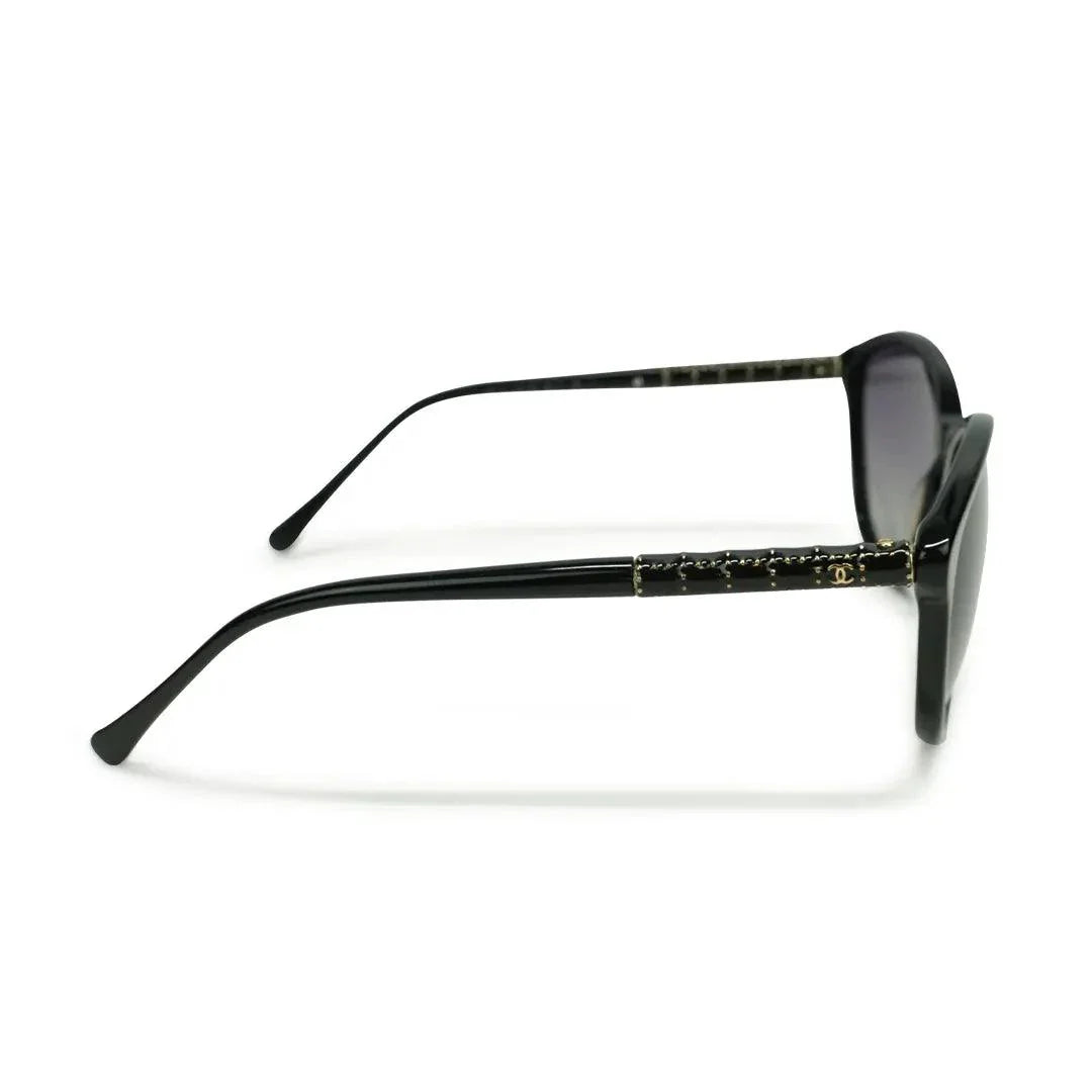 Chanel rounded sunglasses in black acetate with quilted studding on the arms in gold hardware.