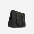 The structured silhouette offers ample space for daily essentials while maintaining a polished, versatile look. Finished with champagne gold-tone hardware, the tote includes leather-threaded chain shoulder straps, comfortable shoulder pads, and a spacious, fabric-lined interior with multiple compartments to keep you organised on the go.