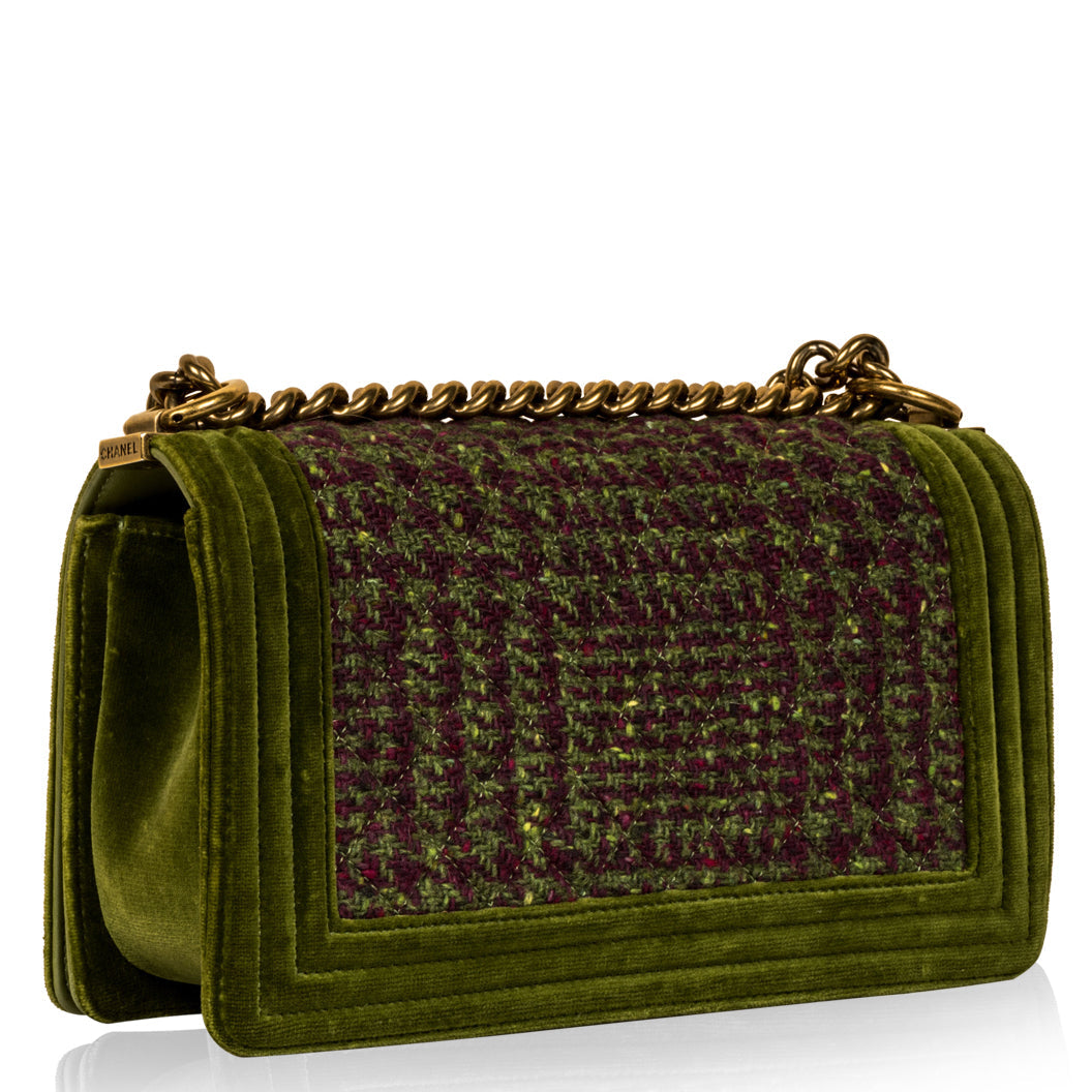 Karl Lagerfield’s vision of the renowned Boy Bag takes a beautiful turn with this seasonal velvet and tweed version. Crafted from green velvet and purple tweed, this effortlessly chic handbag is definitely not one for the faint hearted. Colourful, joyous and a true statement piece, this mixed-material Boy bag is an absolute must-have for any woman with a bold sense of style. With its tartan pattern and antique gold hardware, this Chanel Boy is fun and playful while remaining a timeless classic. The perfect accessory to elevate any neutral or monochromatic look by adding a bold pop of colour, this Boy is one that will never make you cry and always put a smile on your face.