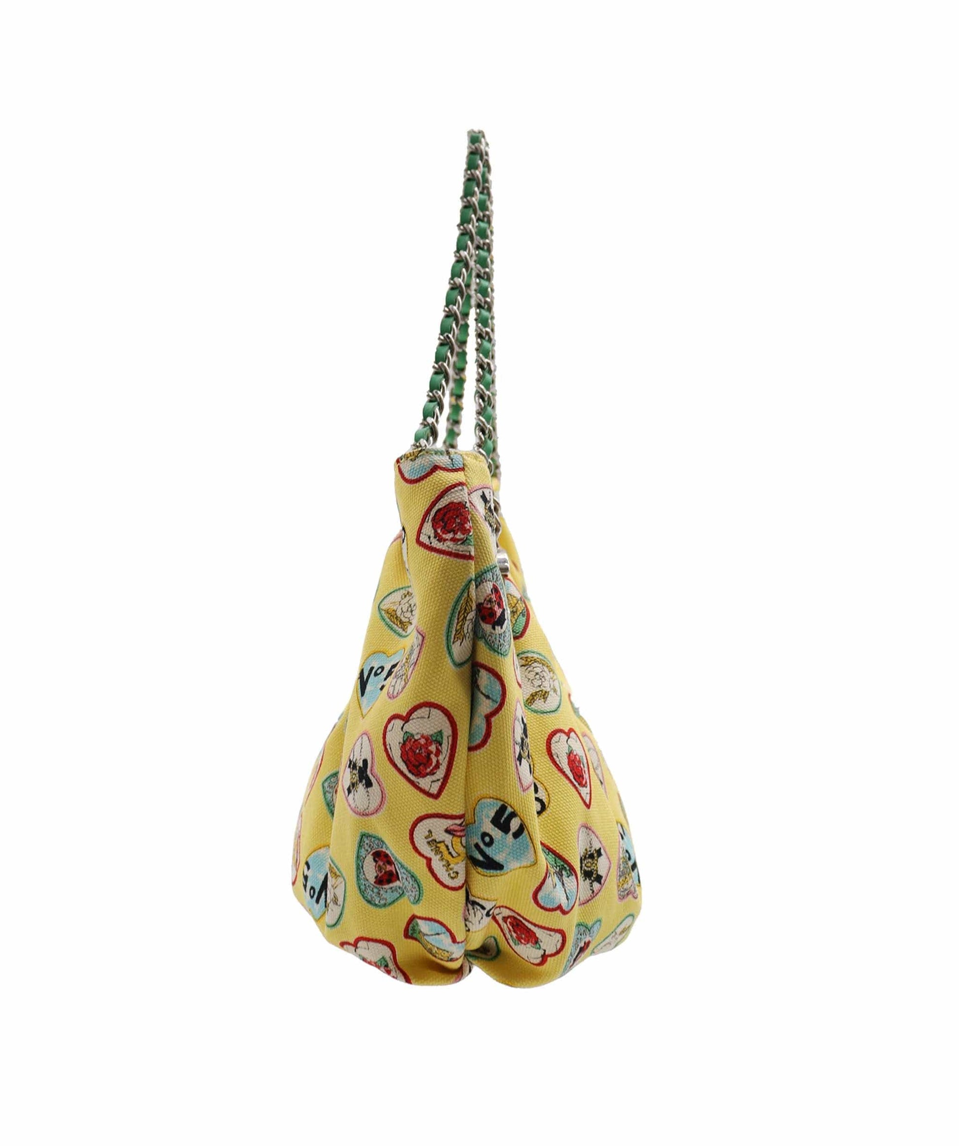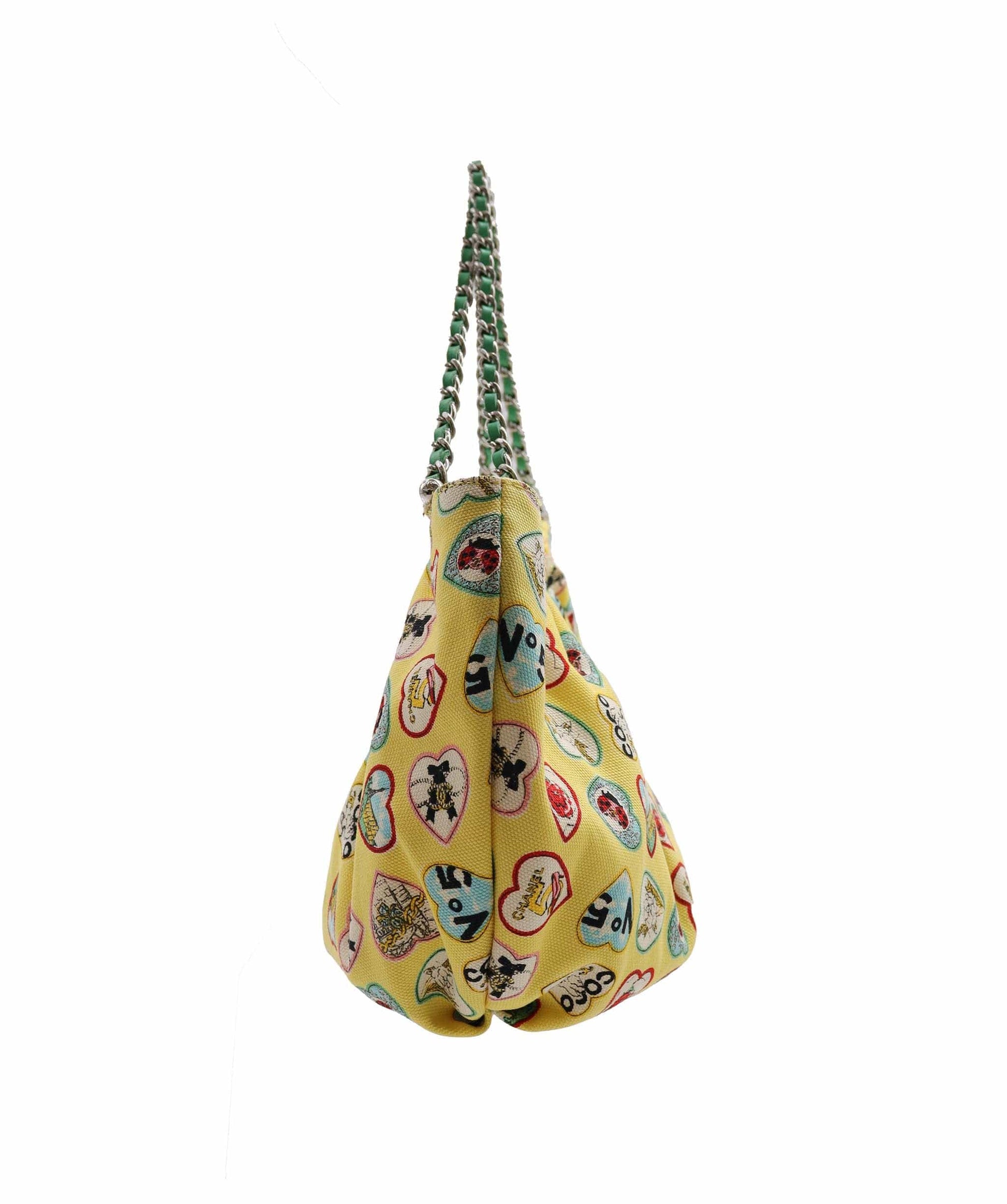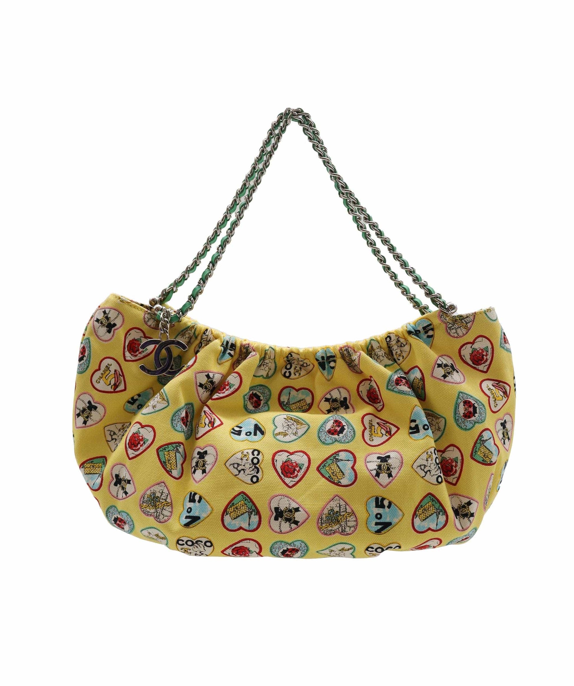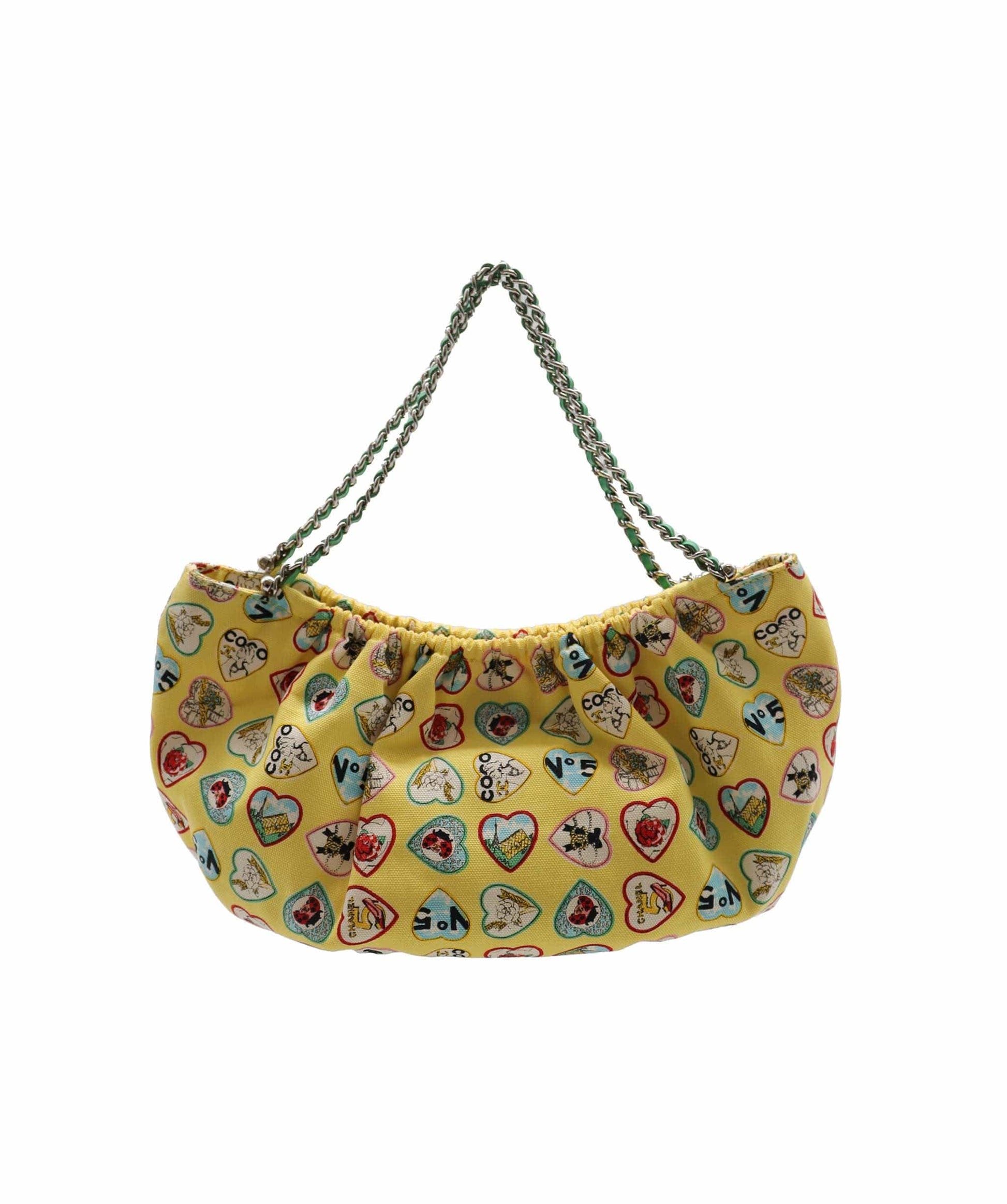 Description: Chanel valentine yellow canvas bag. Super rare collectible yellow Chanel heart bag from 2016. Featuring Hearts with the story of Chanel.