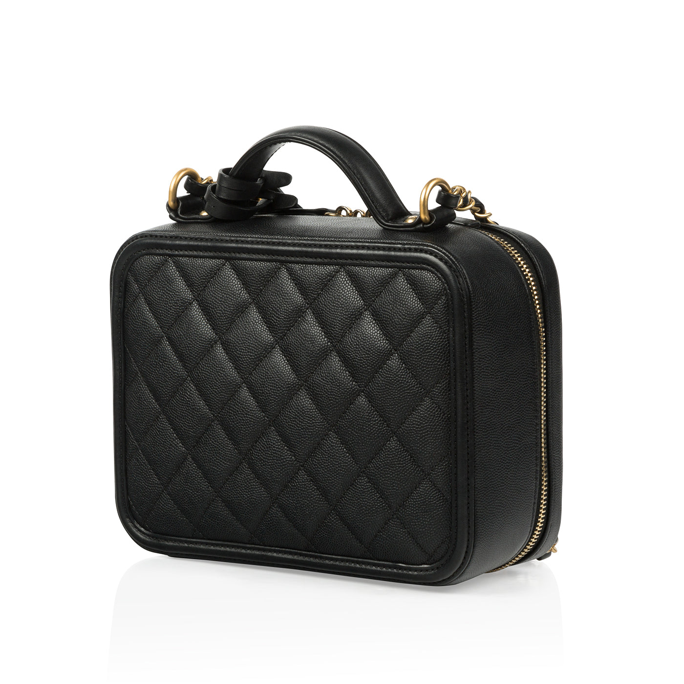 Chanel has been manufacturing their acclaimed Vanity Case as far back as the 1980’s. Primarily designed to hold a lady’s cosmetics, the handbag fast became more of a fashion statement than a mere vanity case. Fast forward to 20 years, the modernised Vanity case comes in an array of colours and sizes. Here, we have Chanel’s Black Caviar Medium Filigree Vanity Case, one of the most acclaimed in the collection. Featuring a gorgeous caviar exterior and the coveted CC logo stitching, it is not very difficult to grasp why it is so highly-acclaimed. The bag is adorned with beautiful gold toned hardware and comes complete with key and clochette. The zip-around design opens up to a ravishing leather interior, featuring an array of spacious storage compartments. Whether you are after an elegant handbag for functions or quite simply afternoon tea; the Chanel Vanity Case could not be any more perfect.