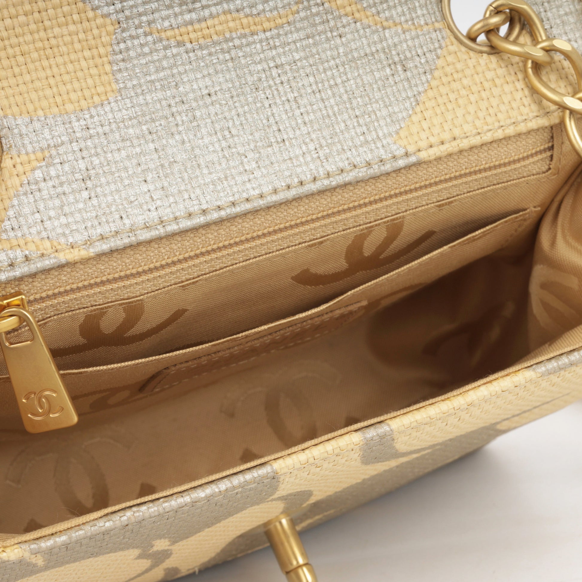 Chanel Vintage Mini Square Beige Camellia Raffia Antique Gold Hardware
