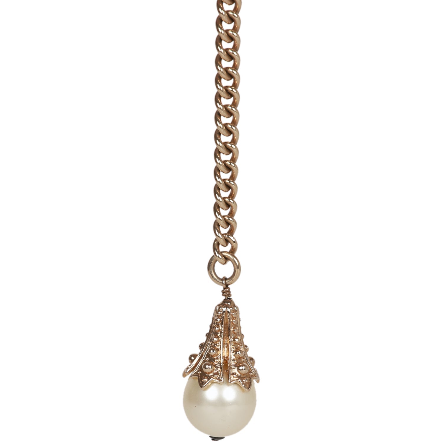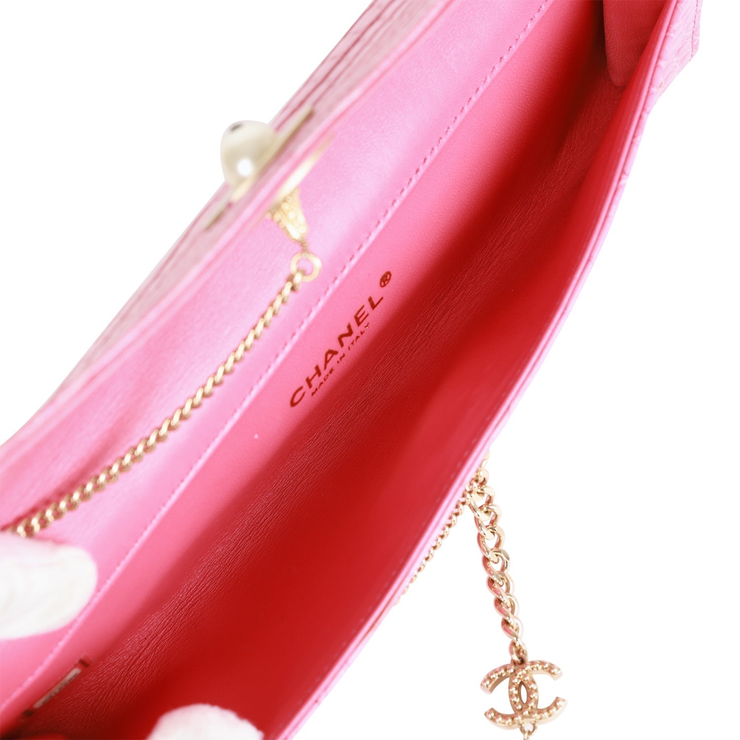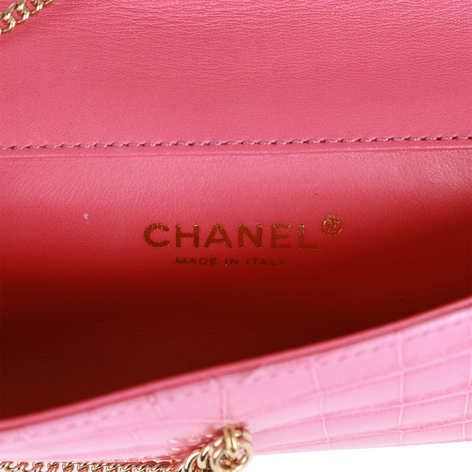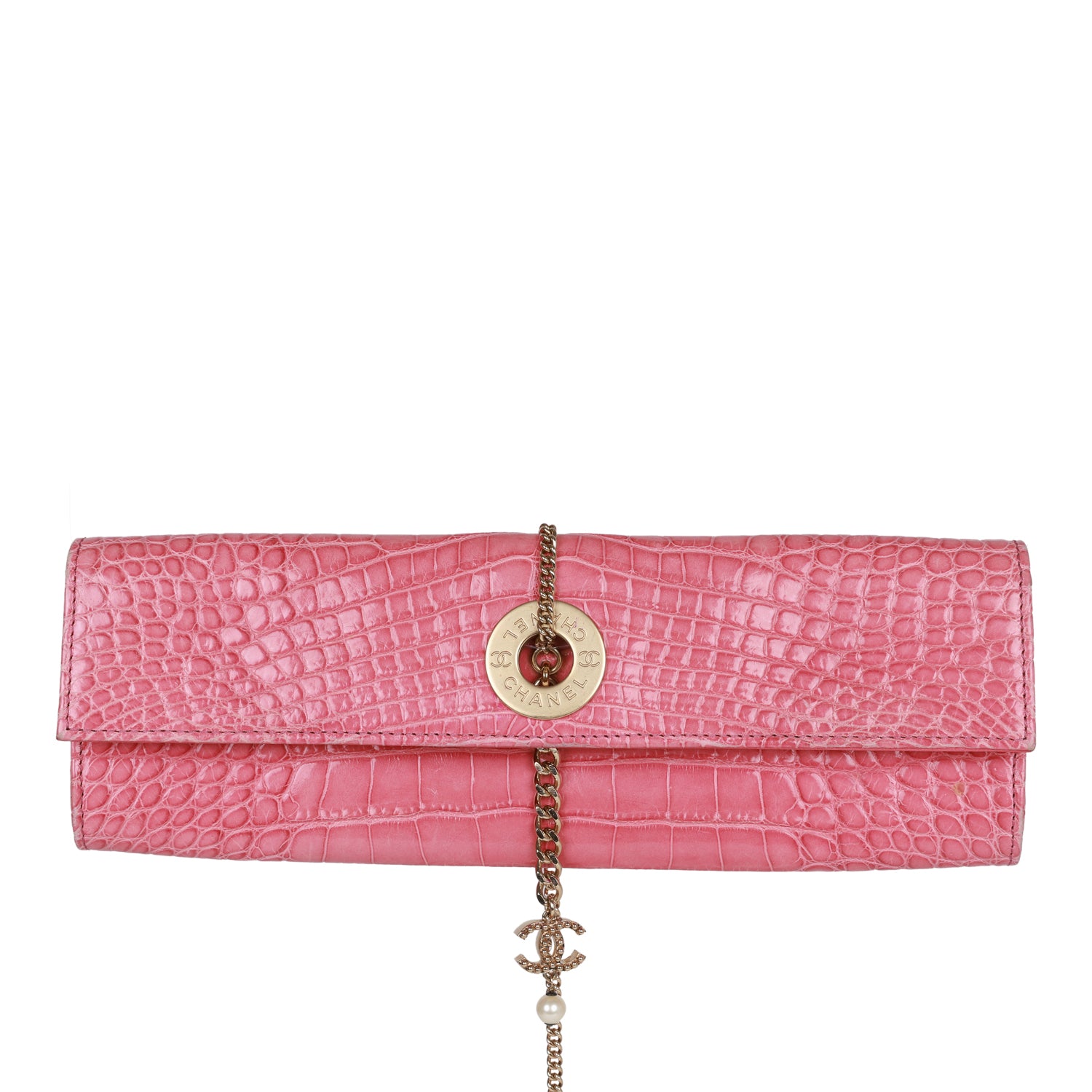 This Clutch is in Pink shiny crocodile and features a Gold Chain pull-through closure with CC Logo pendant and two faux pearl pendants.